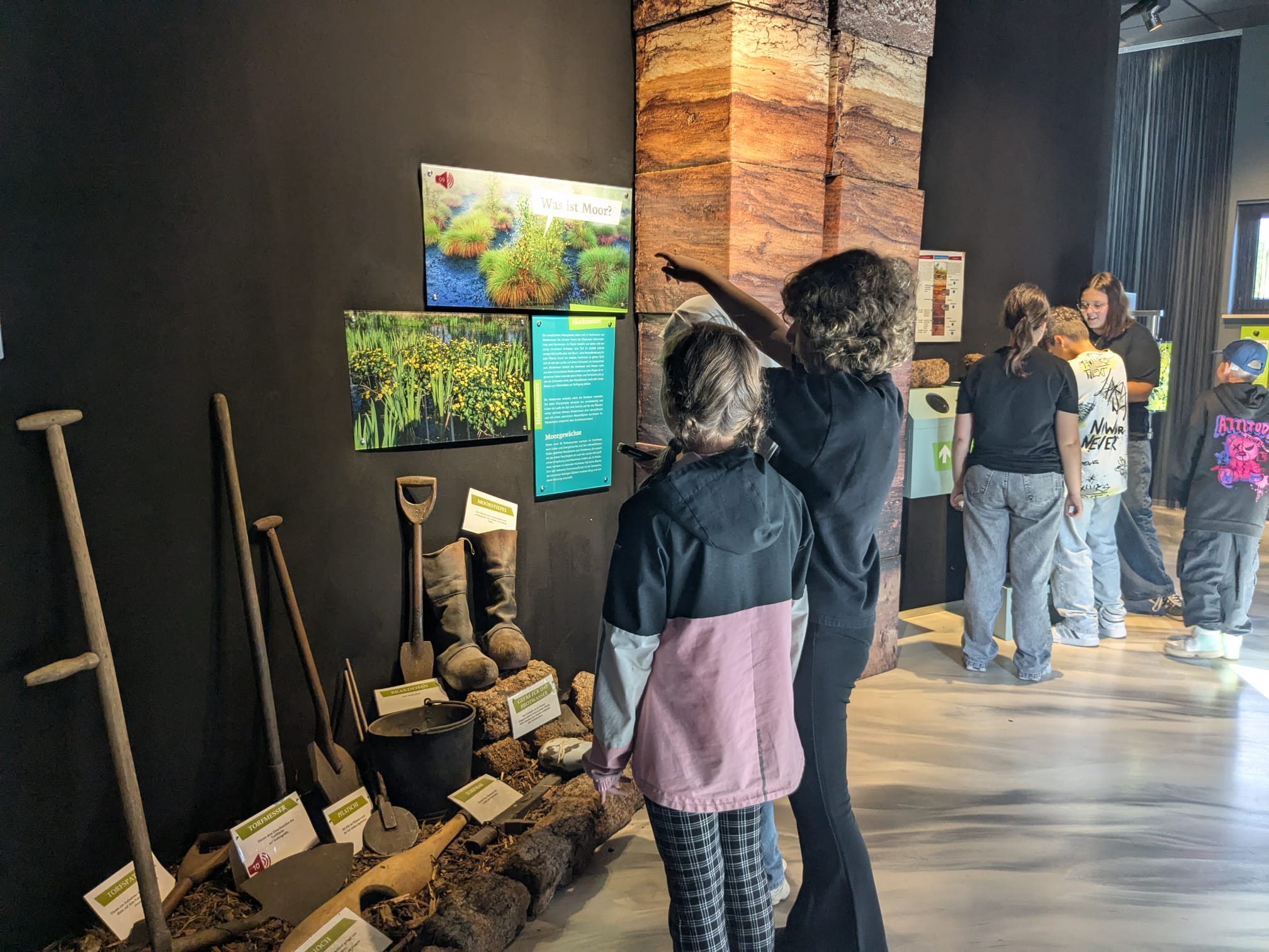 Im Europäischen Fachzentrum für Moor und Klima (EFMK) wurde der Besuch mit einem Film eröffnet, der die Entstehung der Moore anschaulich erklärte. Eine ungewohnt gruselige Erzählerstimme verlieh dem Ganzen eine besondere Note und machte den Film für die Schülerinnen und Schüler zu einem kleinen Erlebnis. Anschließend durchliefen die Gruppen die Ausstellung mit Audioguides und lösten interaktive Quizaufgaben – dabei erfuhren sie viel über die wichtige Rolle der Moore im Klima- und Naturschutz.