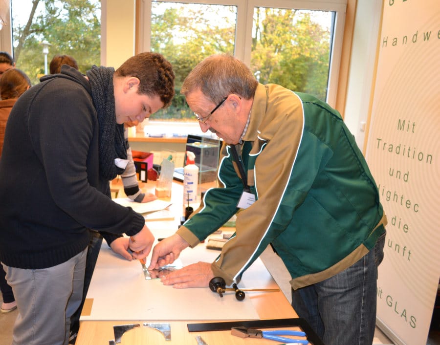 Konzentriert hält Nick die flache Zange in der Hand. „Jetzt nicht zu fest und auch nicht zu vorsichtig“, gibt ihm sein Gegenüber als Tipp und hält dem Realschüler die noch unbearbeitete Spiegelfläche entgegen. Dann macht es ganz leicht „knack“, und nach wenigen geschickten Handgriffen hält Nick einen von ihm selbst zugeschnittenen Taschenspiegel in der Hand.