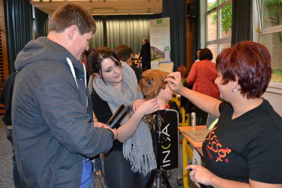Robin nimmt eine Haarsträne der lebensecht wirkenden Frisierpuppe in die rechte Hand, mit der linken hält er noch etwas zaghaft ein aufgeheiztes Glätteisen. „Ganz, ganz langsam die Strähne entlangfahren und das mit nicht zu viel Druck“, lautet die Hilfestellung der Friseurin. Dass Jungen auch einmal „typische Frauenberufe“ kennenlernen und Mädchen „Männerberufe“ und diesen gegenüber ihre Scheu und Vorurteile ablegen, ist ein weiterer Bonus der berufsorientierenden Maßnahme.
