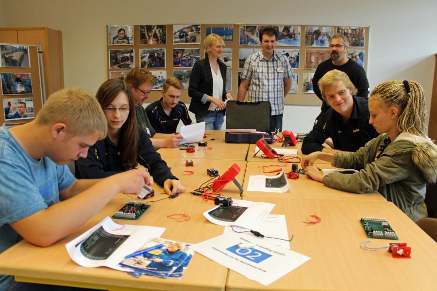 Einblick in die praktische Ausbildung zum Elektroniker gab es unter Mitarbeit von Auszubildenden durch Ausbildungsmeister Nico Segelhorst (4.v.r.) und Ausbildungsmeister Klaus Brüggemann (3.v.1.) von der Wintershall Holding. Mit dabei André Pfennig (3.v,r.) und Christine Kalvelage (Mitte).