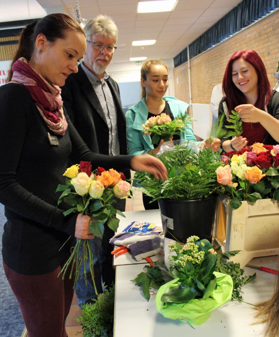 Bunt und duftend: Floristikmeisterin Daniela Sowiak (links) führte in ihren Beruf ein. lnteressiert war auch Realschulleiter Uwe Hofemeister.