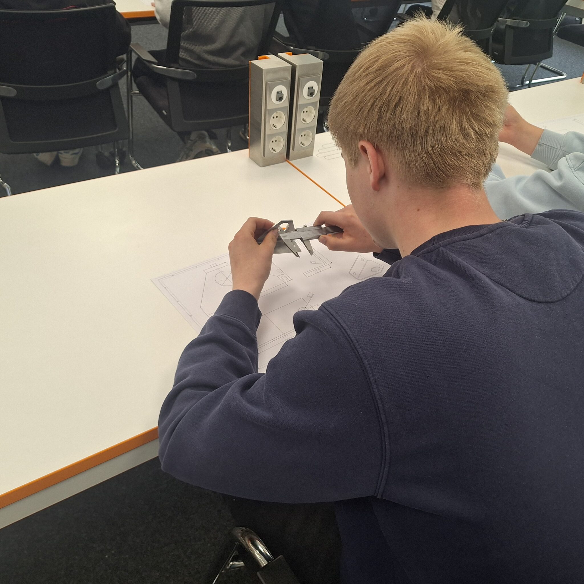 Nach einer kurzen Pause konnten die Schülerinnen und Schüler an drei verschiedenen Stationen selbst aktiv werden. Dabei lernten sie unterschiedliche technische Berufe praxisnah kennen. Es wurden unter anderem der Messschieber ausprobiert, Kartons verpackt und elektrische Versuche durchgeführt – ein abwechslungsreicher und praxisorientierter Einblick in verschiedene Arbeitsfelder.