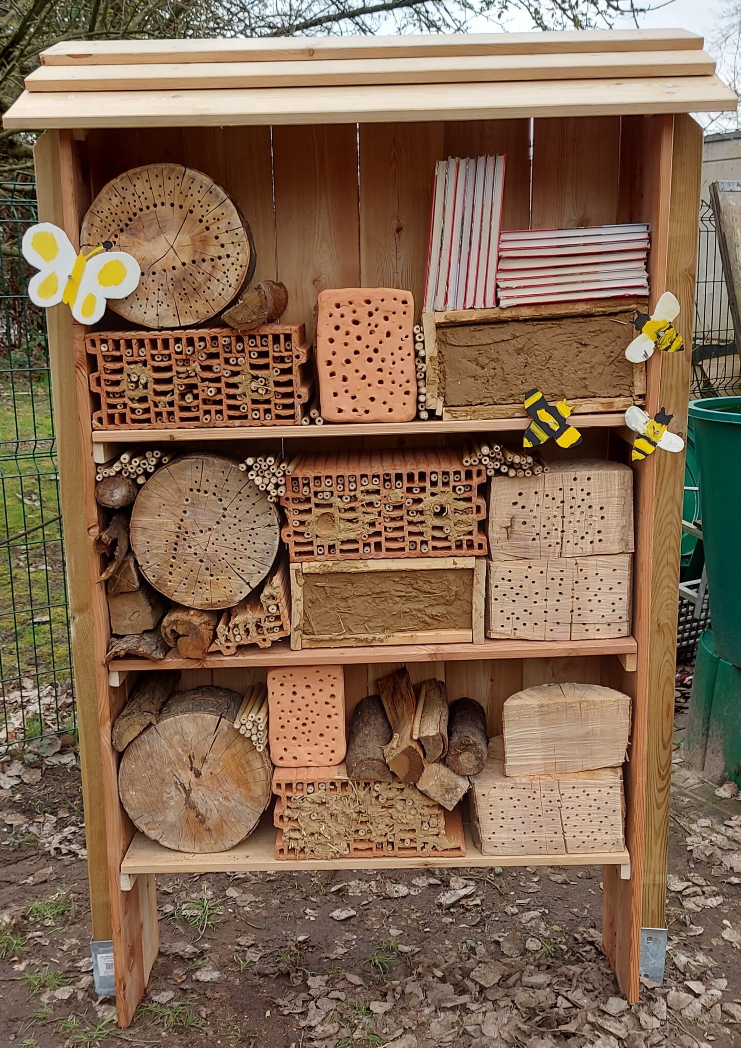 Ein Highlight war schließlich das Aufstellen und Befüllen des Insektenhotels im Schulgarten. Die Arbeit zahlt sich nun aus. Mit viel Freude und Sorgfalt wurden die Materialien in die unterschiedlichen Fächer gestellt sowie ausgerichtet – mit einem tollen Ergebnis.