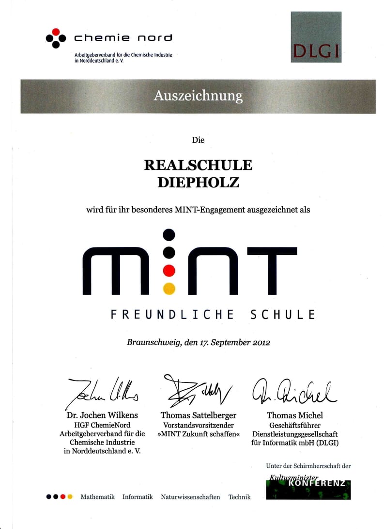 MINT-freundliche Schulen müssen einen einheitlichen Kriterienkatalog mit 14 Kriterien erfüllen. Mit Stolz bemerkte die Delegation aus der Kreisstadt, dass die Realschule Diepholz bei der Auszeichnungsveranstaltung im Rahmen der Jahrestagung der Gesellschaft für Informatik in Braunschweig die einzige Schule in der Wertungsgruppe Sekundarstufe I und II war, die keine Oberstufe hatte. Alle anderen Schulen der Wertungsgruppe waren Gymnasien oder Gesamtschulen.