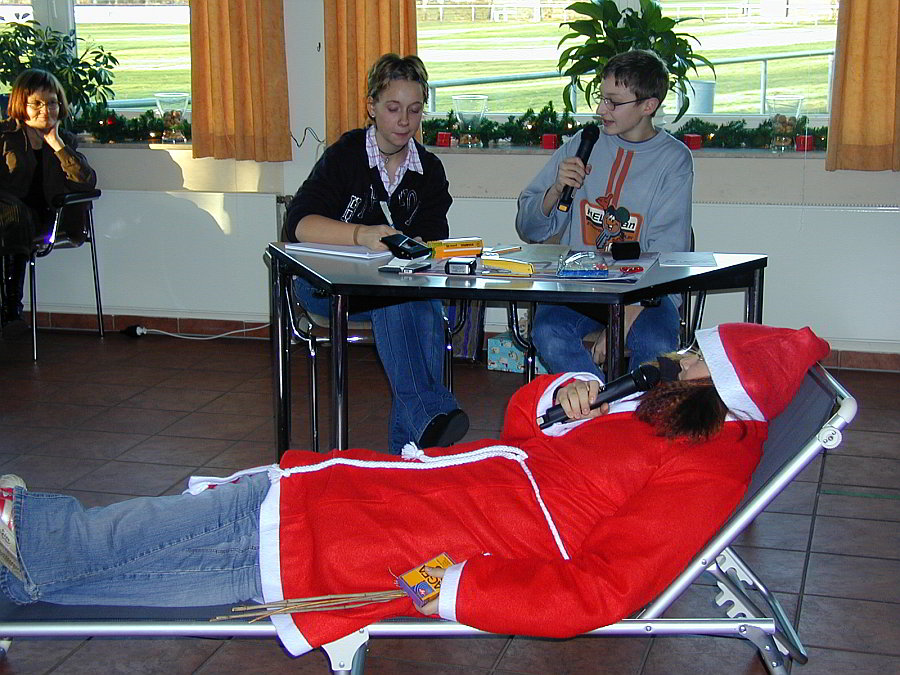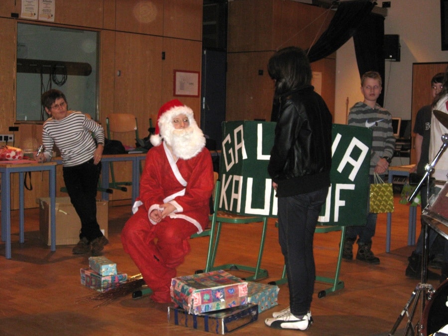 Wir veränderten und erweiterten unser Repertoire an Sketchen und präsentierten hier Weihnachten nicht nur unter religiösem Aspekt, sondern auch auf lustige und kritische Art und Weise. Die Beiträge wurden auch in der Schule im Rahmen einer Weihnachtsfeier für die 5. Klassen aufgeführt.