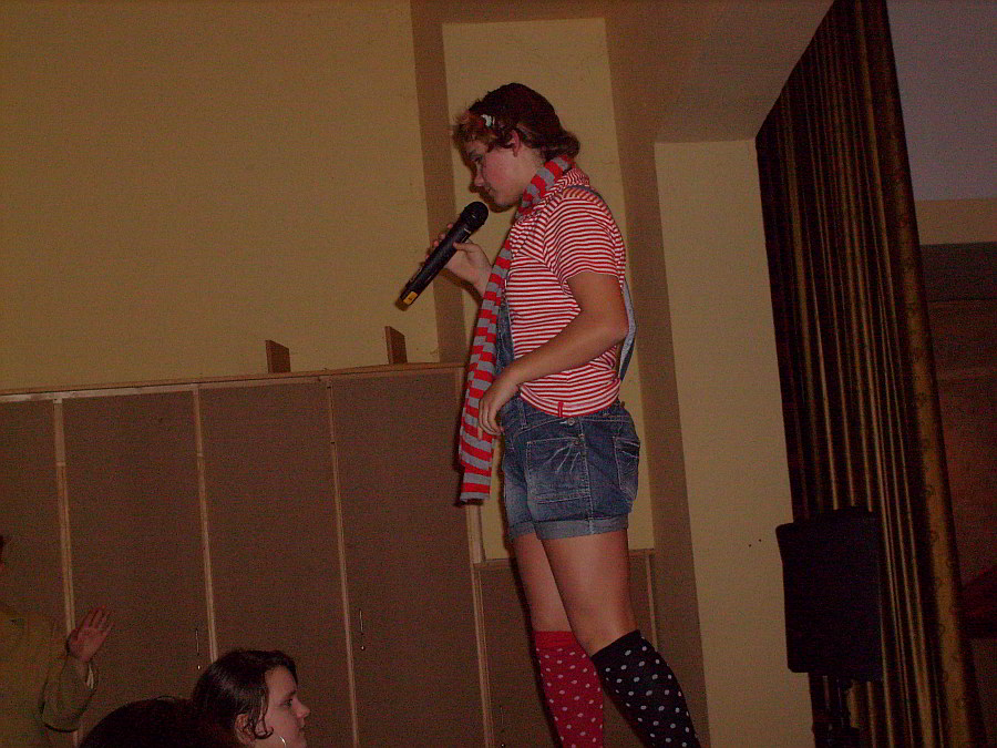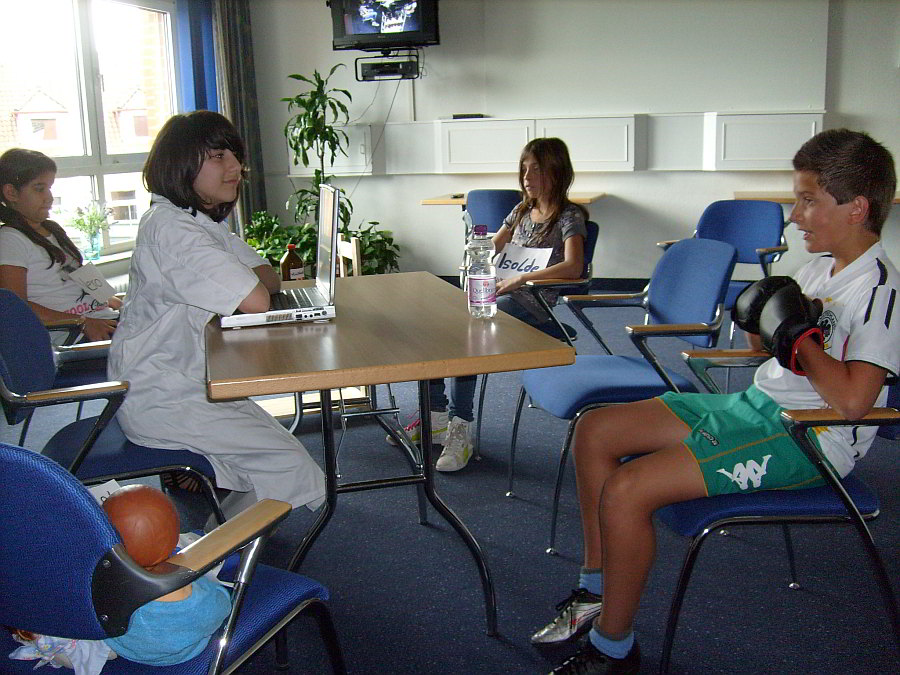 Mit den Schülern der 5. Klassen wurde gleich ein kleines Repertoire an Sketchen eingeübt, die beim DRK und in der Realschule zur Aufführung kamen.