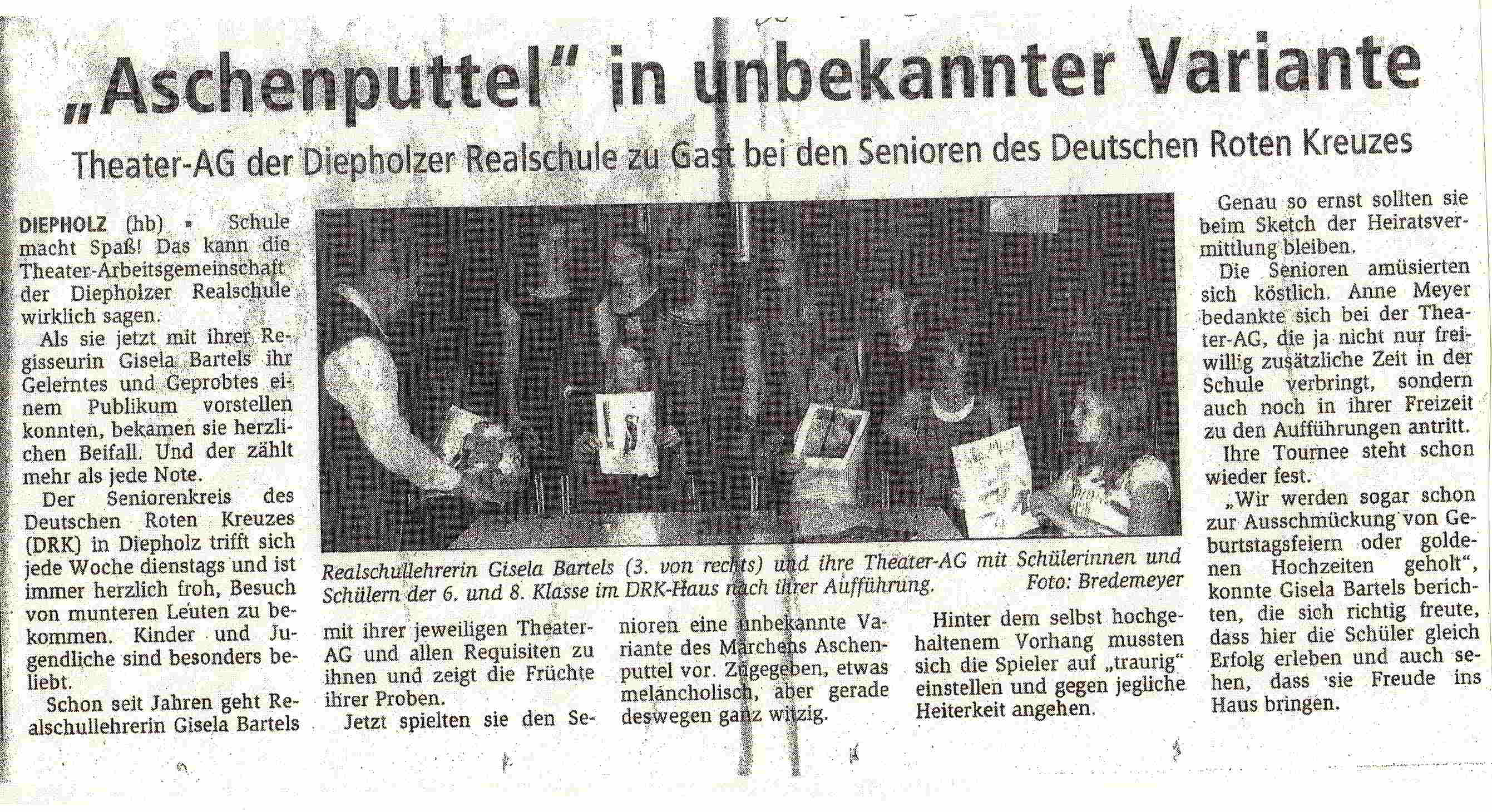 Im Februar 2004 baten uns das DRK Diepholz und Rehden einige kurze Sketche als Beitrag zu deren Karnevalsfeiern mit den Senioren aufzuführen. Im Juli 2004 standen zur Entlassungsfeier mit „Die verflixte Rechenaufgabe“ und „Hausaufgabenblues“ zwei neue Stücke auf dem Programm. Zu diesem Zeitpunkt hatte die AG sehr wenige Mitglieder und wir benötigten dringend Nachwuchs.