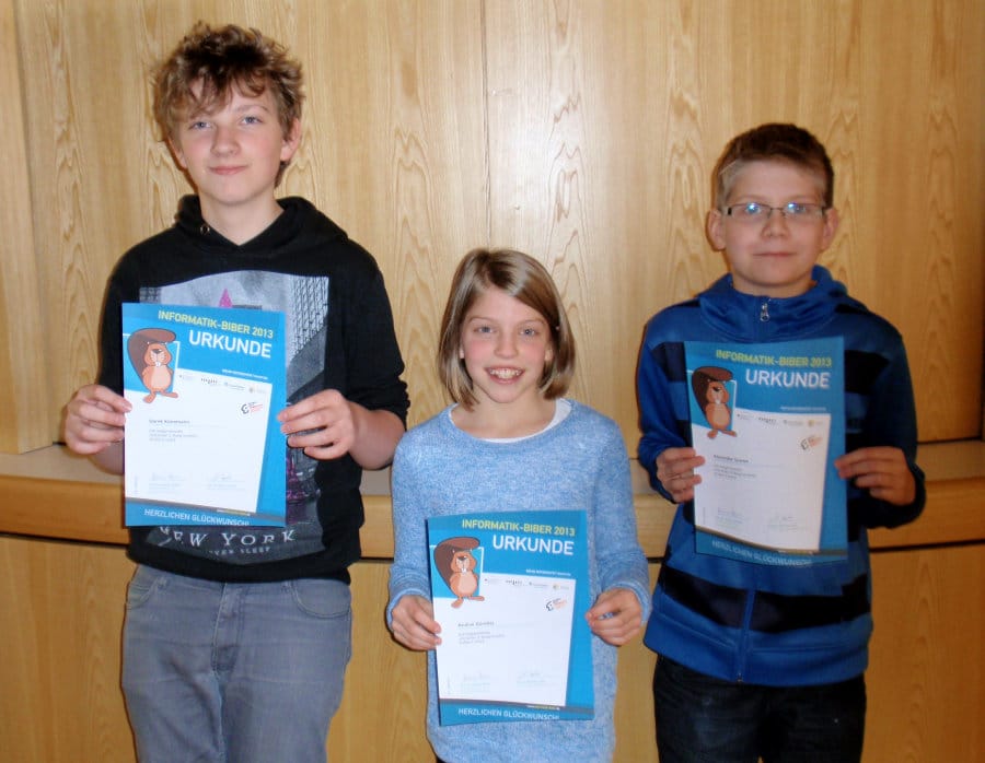 Das Foto zeigt die drei erfolgreichsten Teilnehmer unserer Schule, die alle Schüler der 6a sind. Bester Teilnehmer: Darek Könemann (links), zweite mit gleicher Punktzahl: Pauline Günther und Alexander Grewe