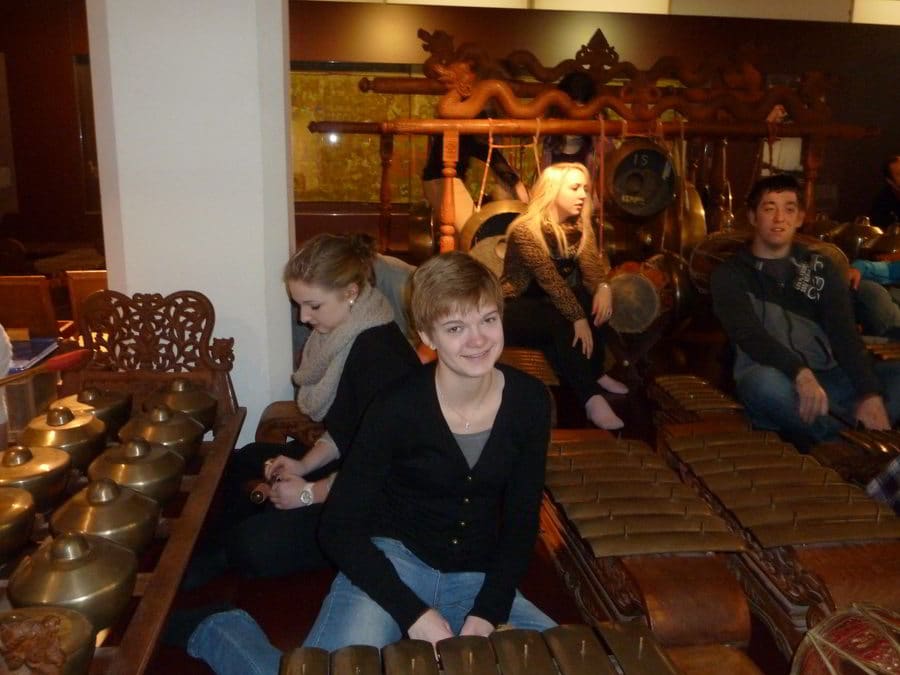 Aus Respekt vor den Göttern und den Instrumenten mussten wir vor dem Spielen unsere Schuhe ausziehen. Wir nahmen so Platz, dass jeder ein Instrument vor sich hatte, welches er spielen durfte. Unser Museumspädagoge hat uns einen Takt angegeben, woran wir uns halten sollten. Außerdem hat er uns erzählt, dass man diese Art von Instrumenten nicht nach Noten spielt, sondern nach Zahlen. Deswegen war es für uns ein Leichtes, ein altes indonesisches Volkslied zu spielen.