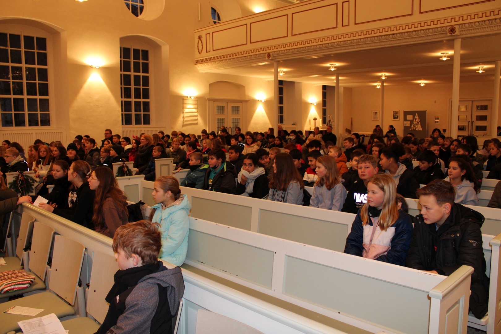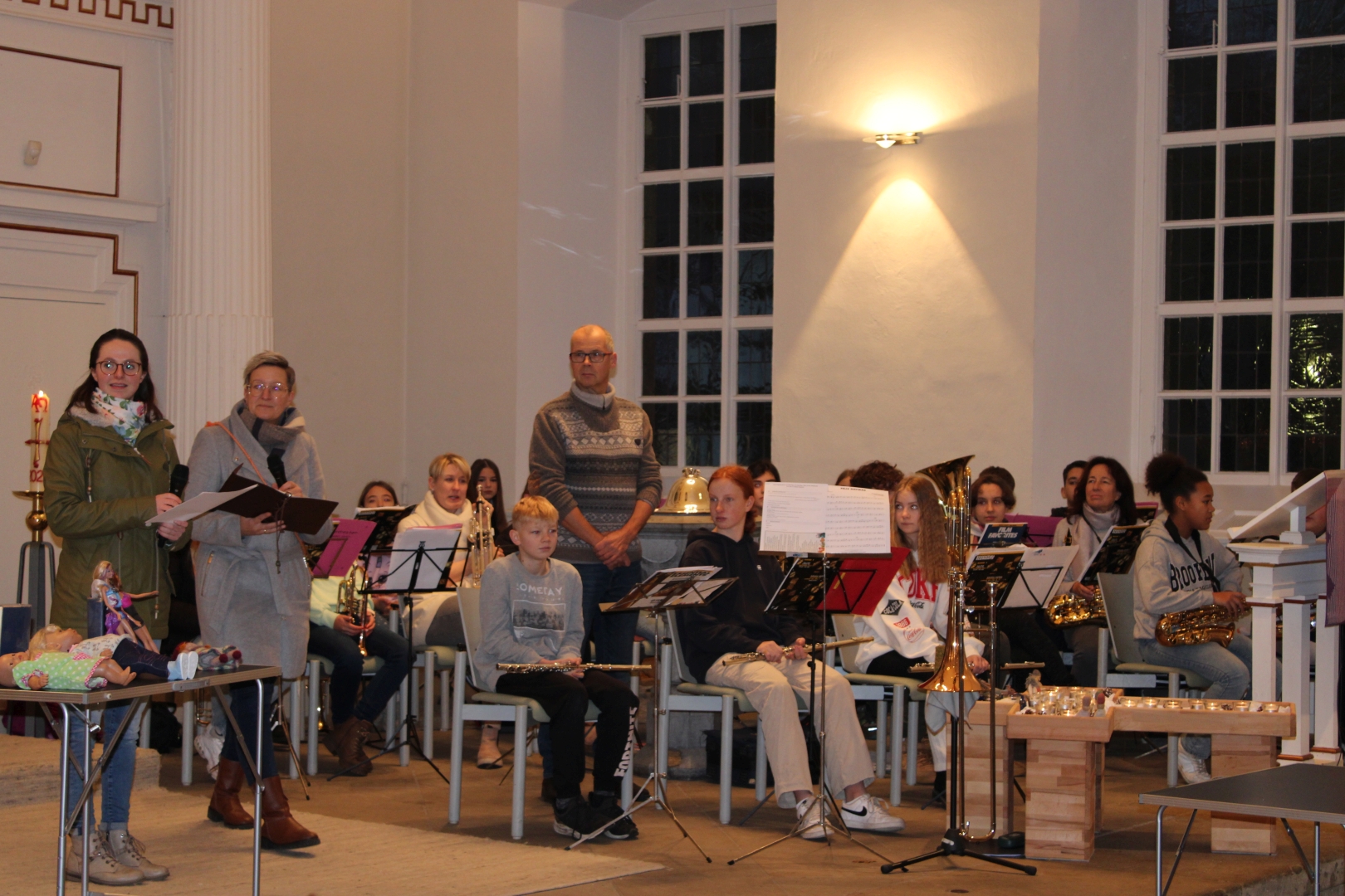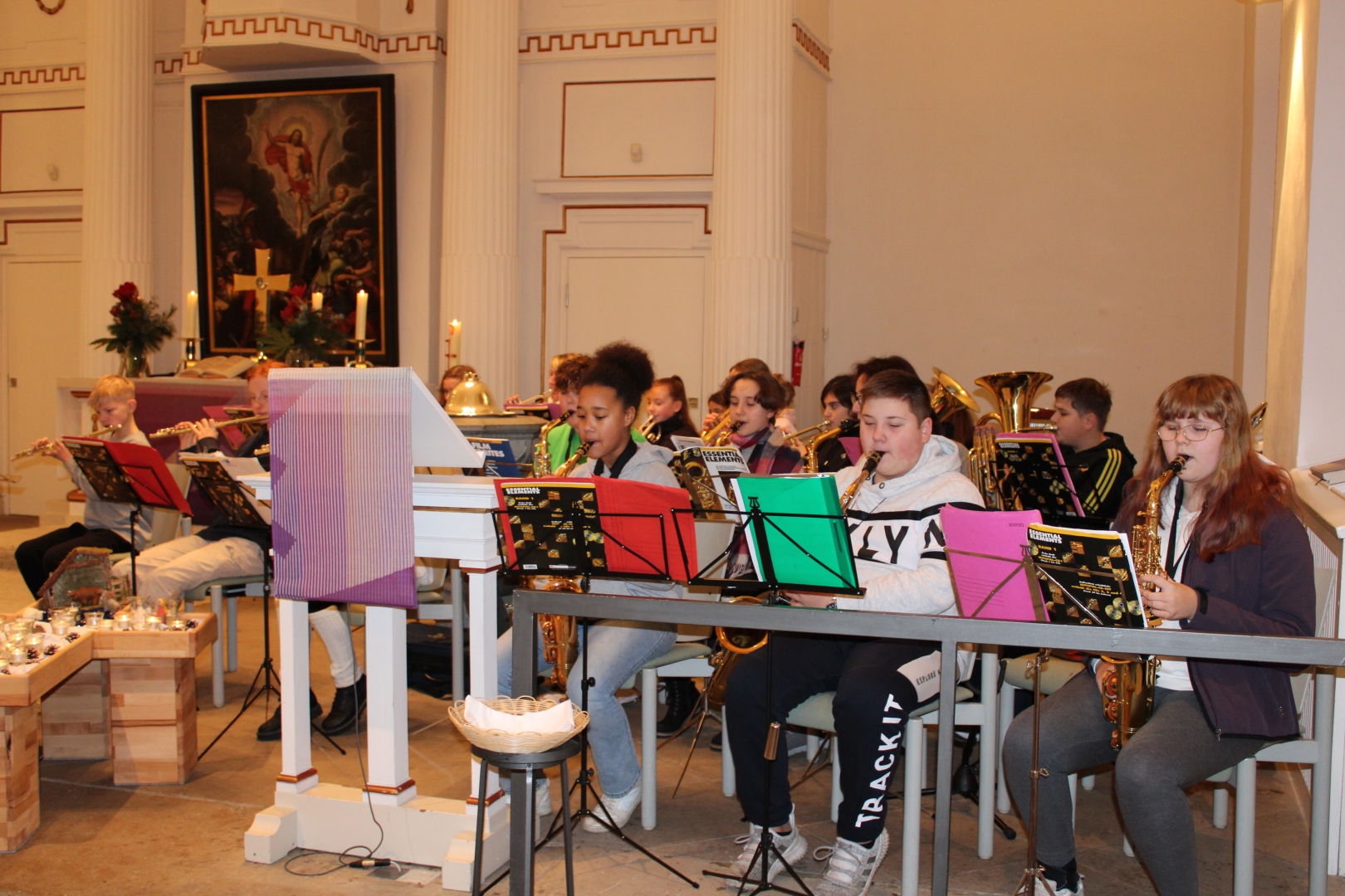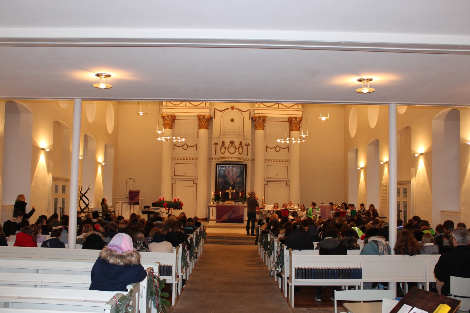 Die Bläserklasse, unter Leitung von Herrn Klöpzig, begleitete die Gemeinde gekonnt. Zum Schluss bekamen alle Anwesenden einen von den Klassen 5a, 6c und 6d selbstgebastelten Stern oder Engel als Geschenk und Andenken.