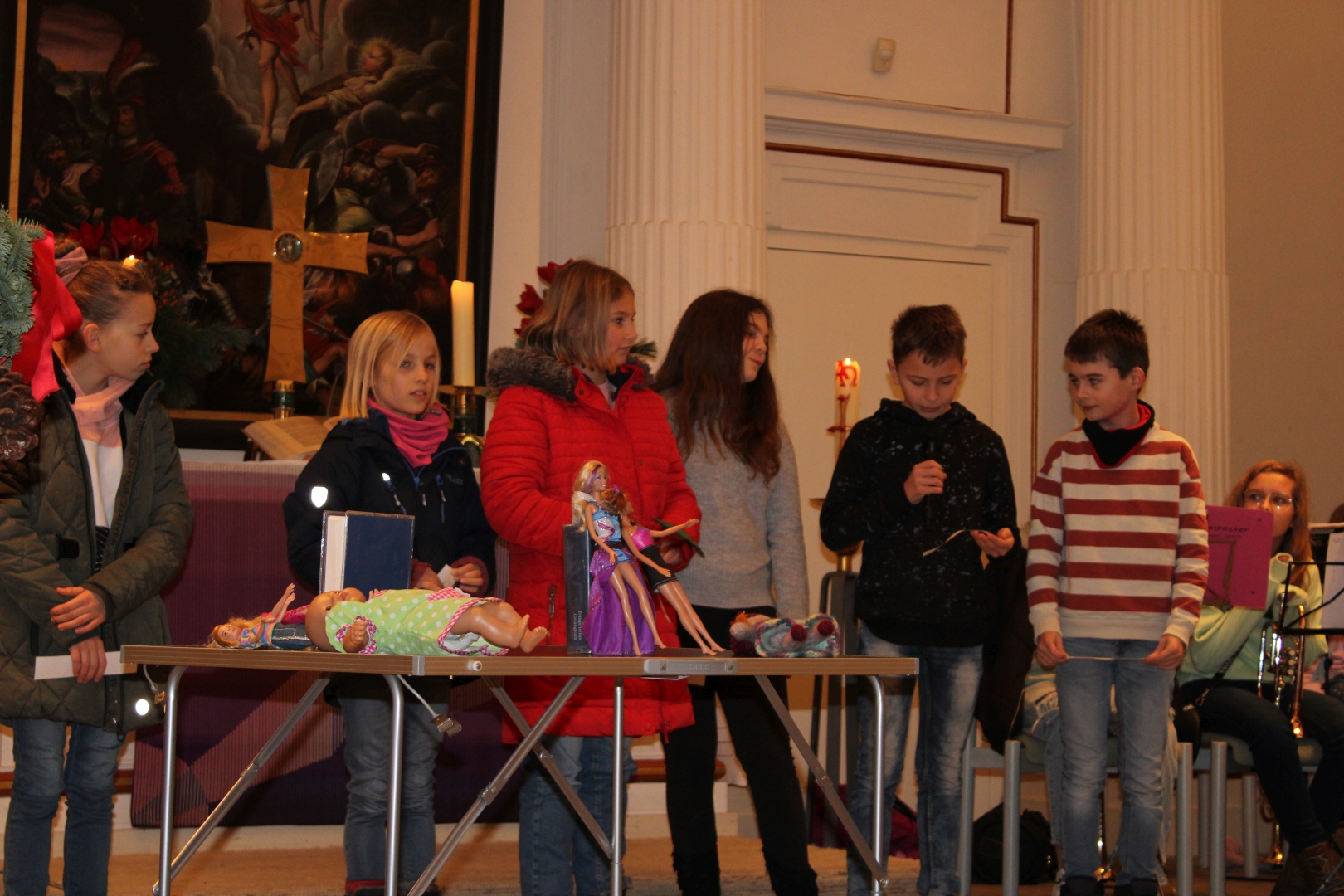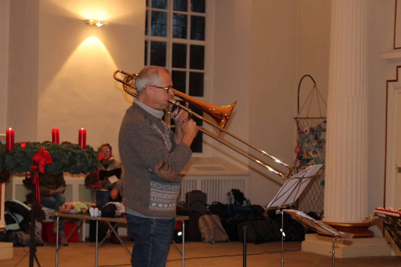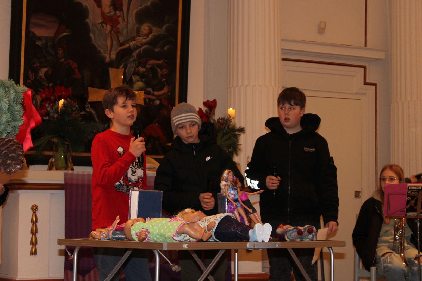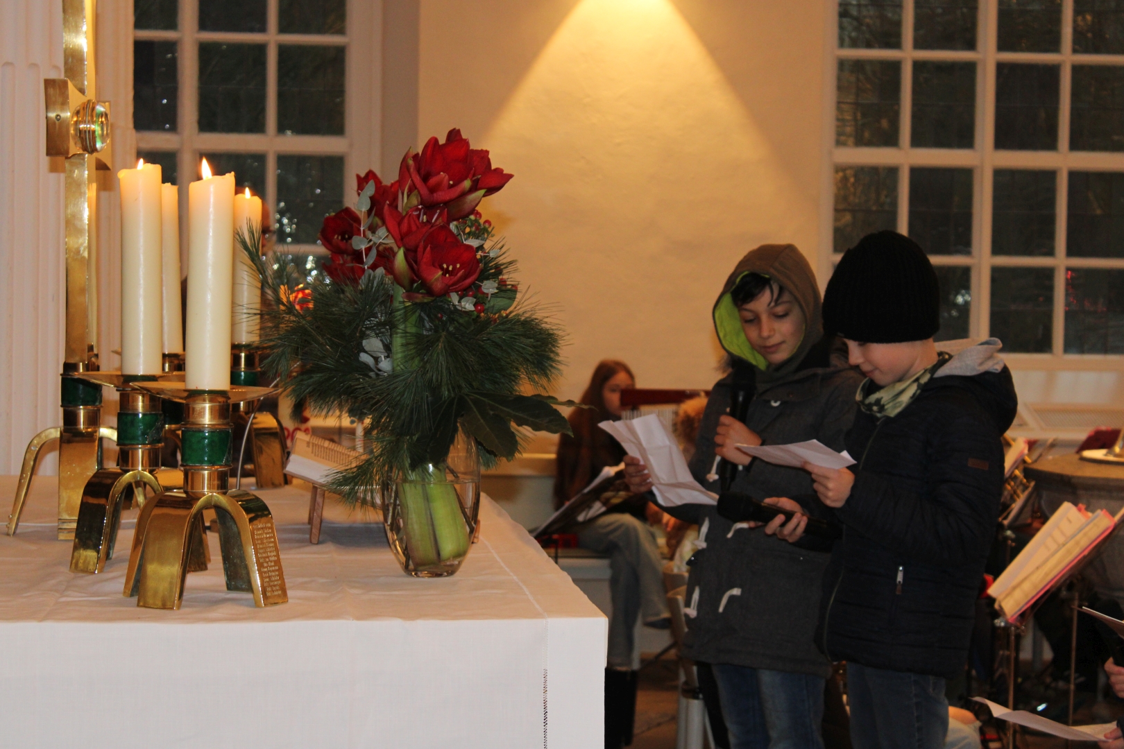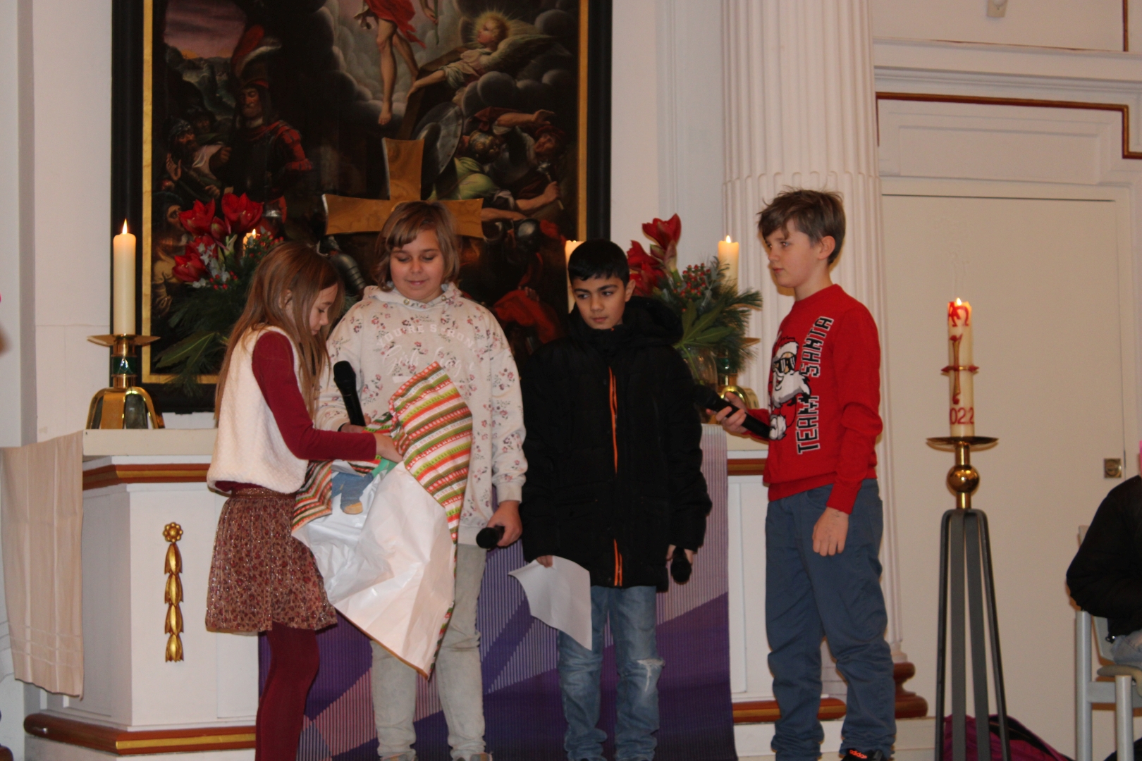 Die Bläserklasse, unter Leitung von Herrn Klöpzig, begleitete die Gemeinde gekonnt. Zum Schluss bekamen alle Anwesenden einen von den Klassen 5a, 6c und 6d selbstgebastelten Stern oder Engel als Geschenk und Andenken.