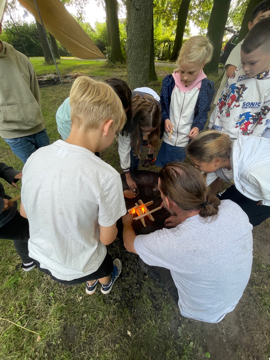 Unter Leitung der Archäologen Thorsten Helmerking und Dr. Hans Joachim Behnke tauchten die frisch eingeschulten Schülerinnen und Schüler in das Leben in der Steinzeit ein. Gemeinsam bauten sie ein Zelt aus Fellen, lernten über das Leben als JägerIn und SammlerIn, machten Feuer und kochten Eier in einem Loch im Boden. Eben all das was die Menschen in der Steinzeit auch gemacht haben. Das Highlight war erneut die Fahrt mit dem Einbaum, bei der nicht immer alle SchülerInnen trocken blieben.