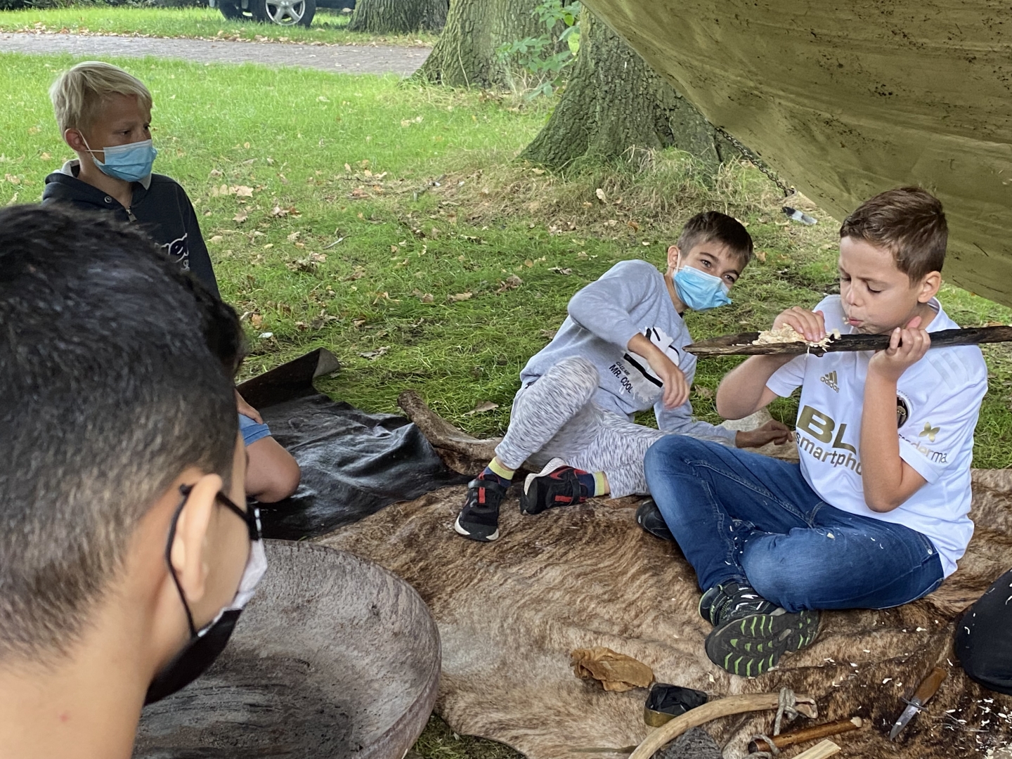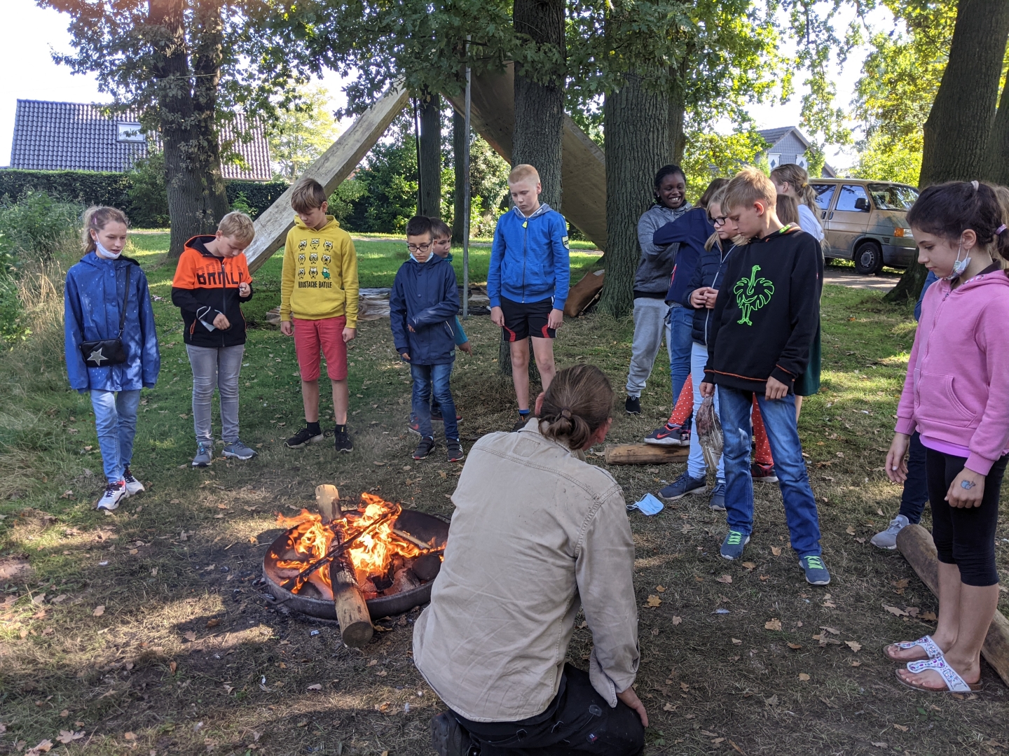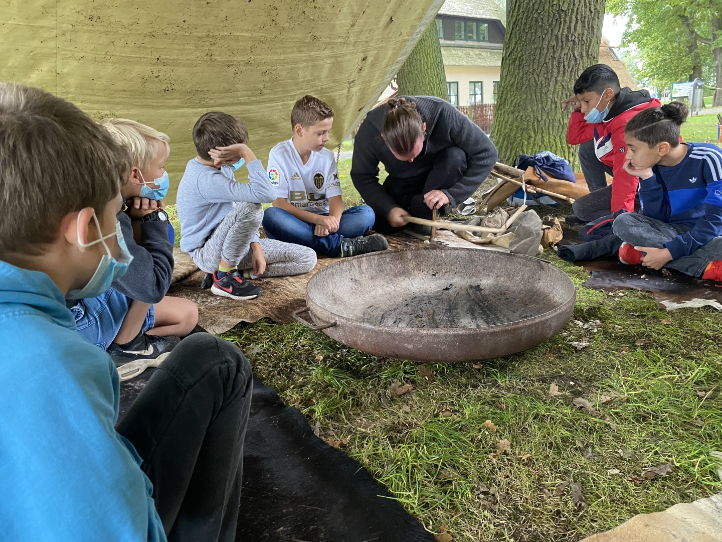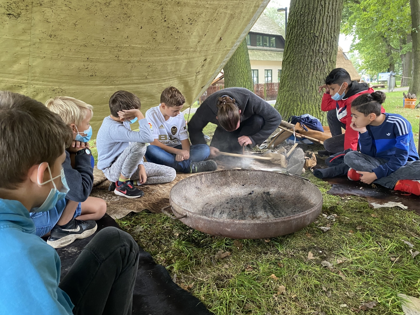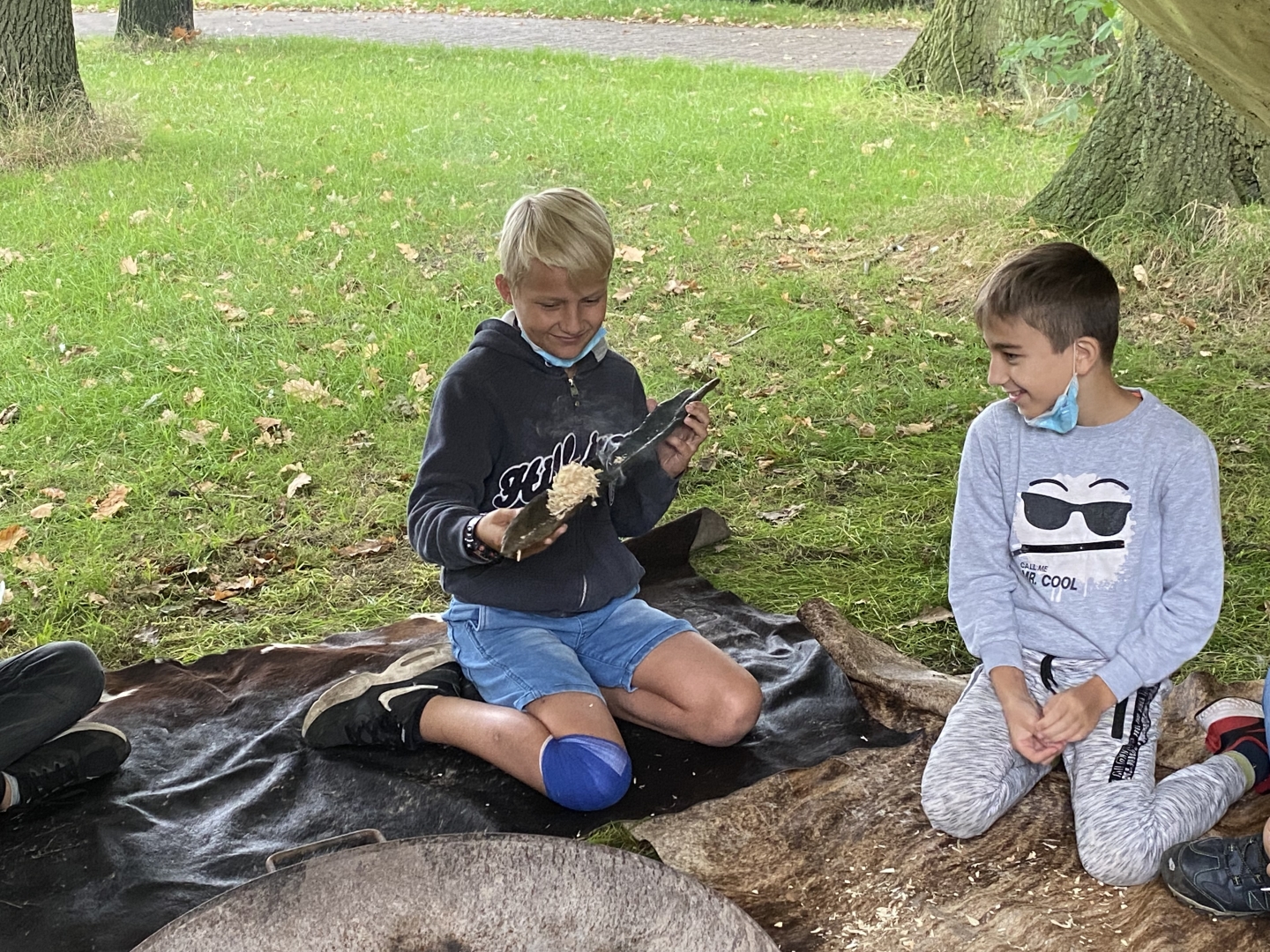 Für die Schüler wurde dank Herrn Dr. Hans Joachim Behnke greifbar, welche Werkzeuge die Menschen in der Steinzeit nutzten, aber auch, wie damals Zelte gebaut wurden. Sie machten wie die Steinzeitmenschen unter Anleitung von Herrn Thorsten Helmerking Feuer. Anschließend erhitzten sie damit Wasser und konnten Eier kochen und diese auch essen. Natürlich mit Salz, das sie zuvor aus Salzwasser gewonnen haben.