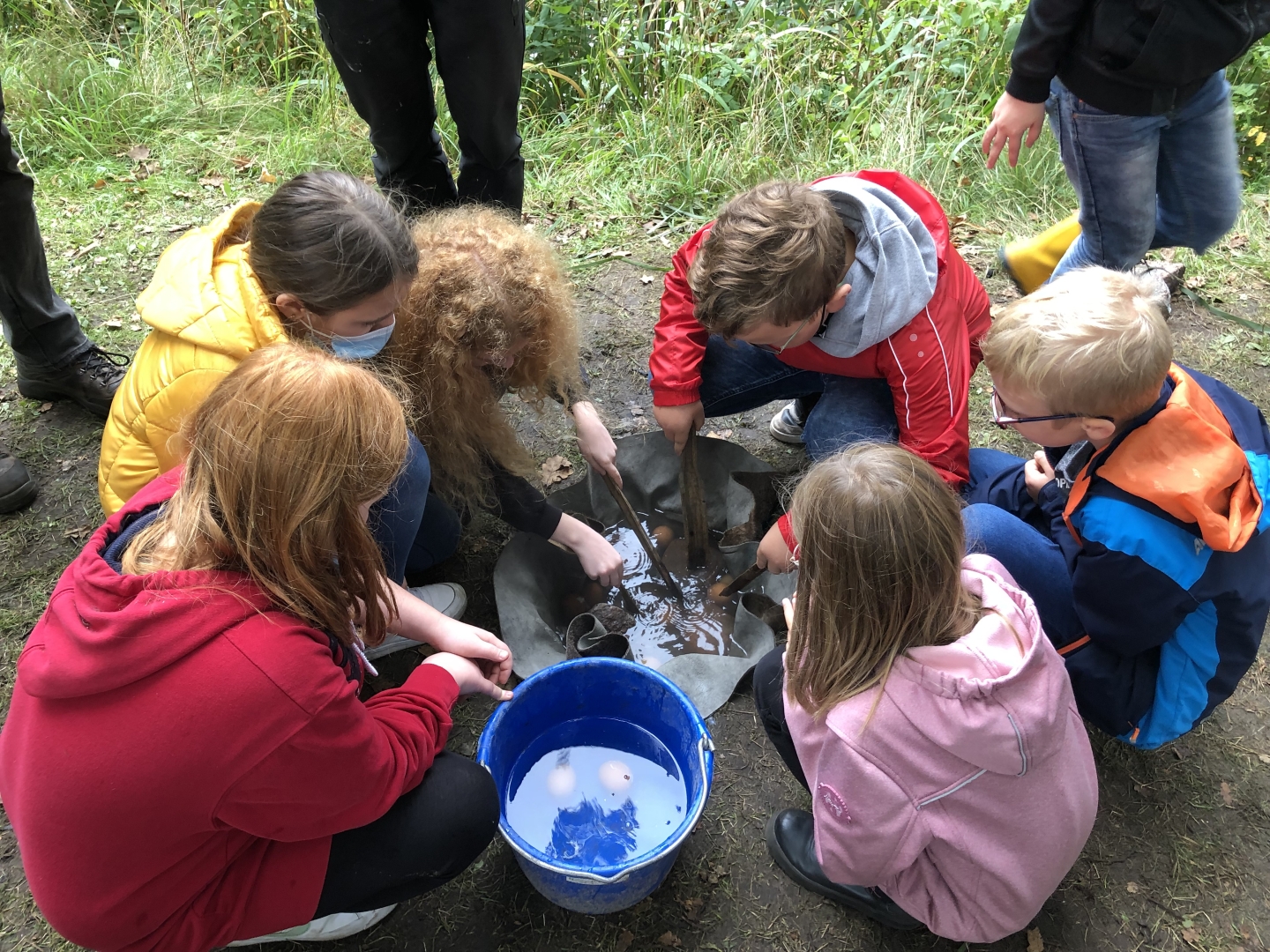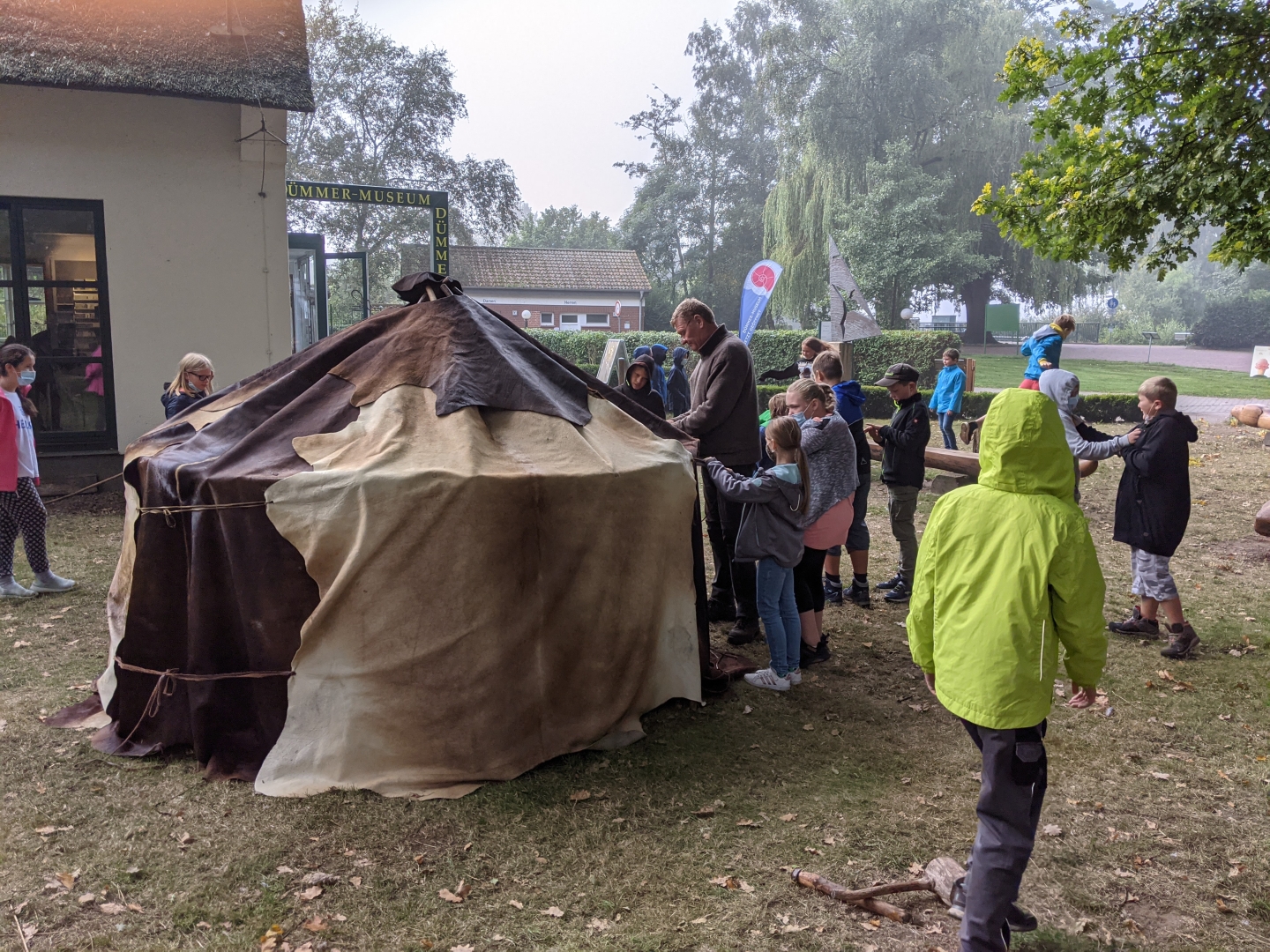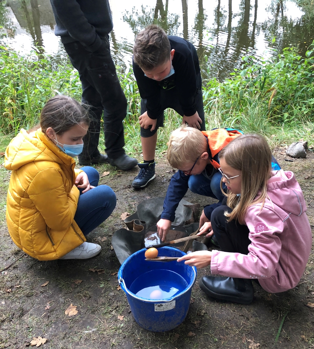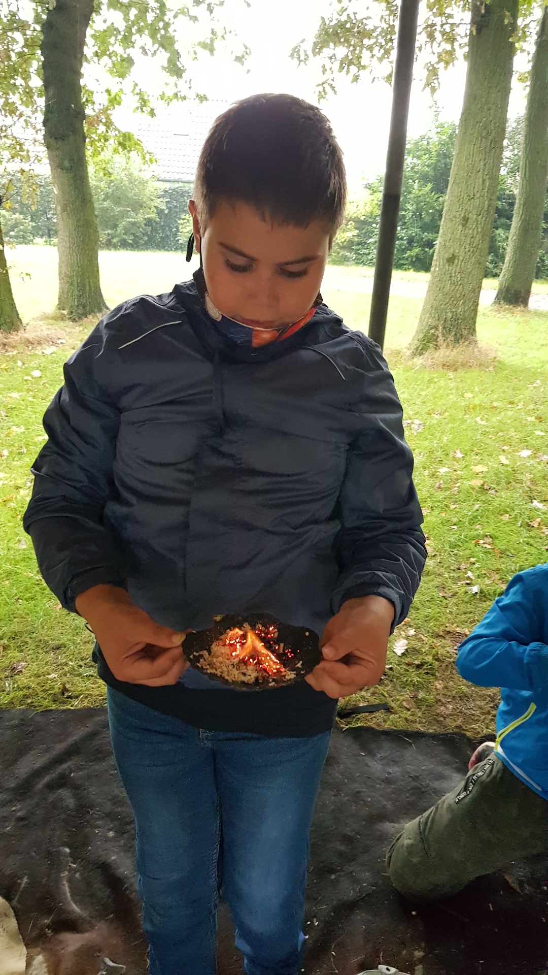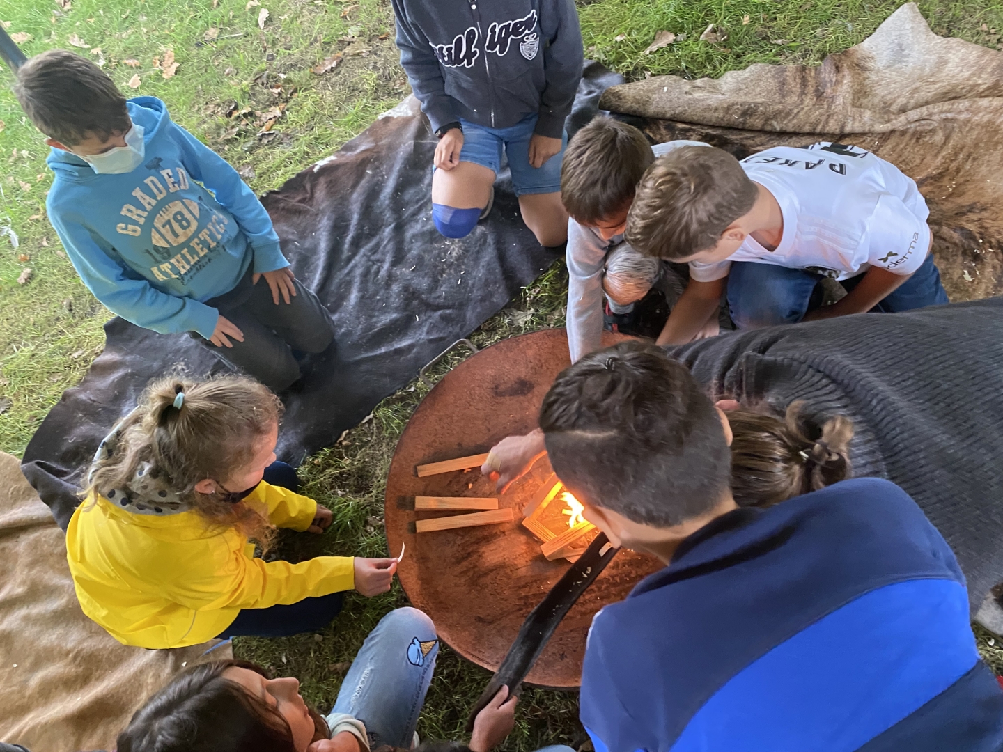 Für die Schüler wurde dank Herrn Dr. Hans Joachim Behnke greifbar, welche Werkzeuge die Menschen in der Steinzeit nutzten, aber auch, wie damals Zelte gebaut wurden. Sie machten wie die Steinzeitmenschen unter Anleitung von Herrn Thorsten Helmerking Feuer. Anschließend erhitzten sie damit Wasser und konnten Eier kochen und diese auch essen. Natürlich mit Salz, das sie zuvor aus Salzwasser gewonnen haben.