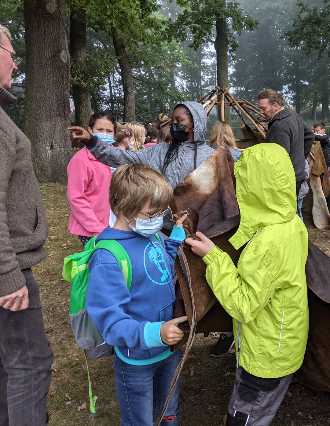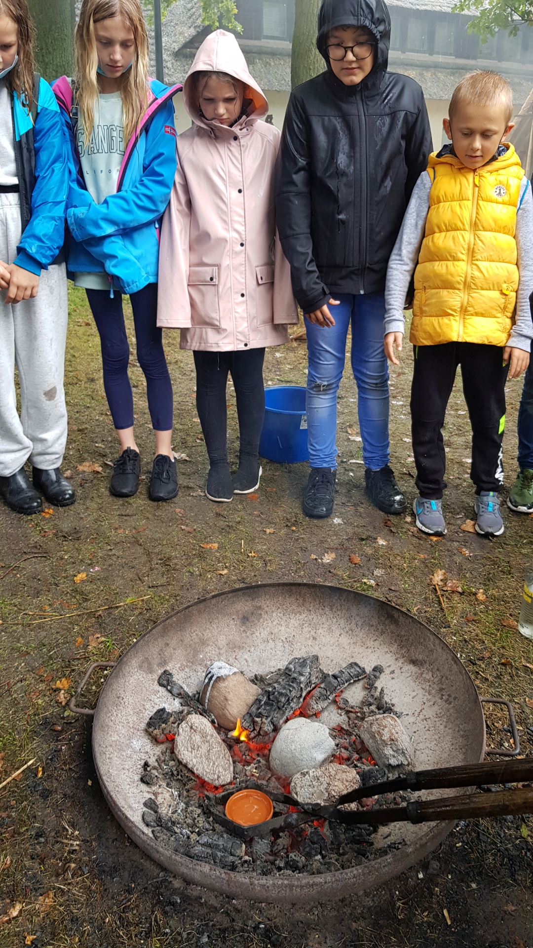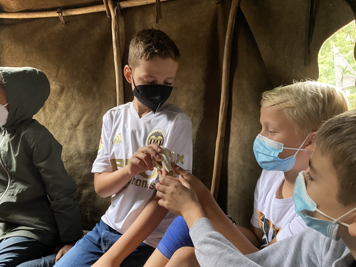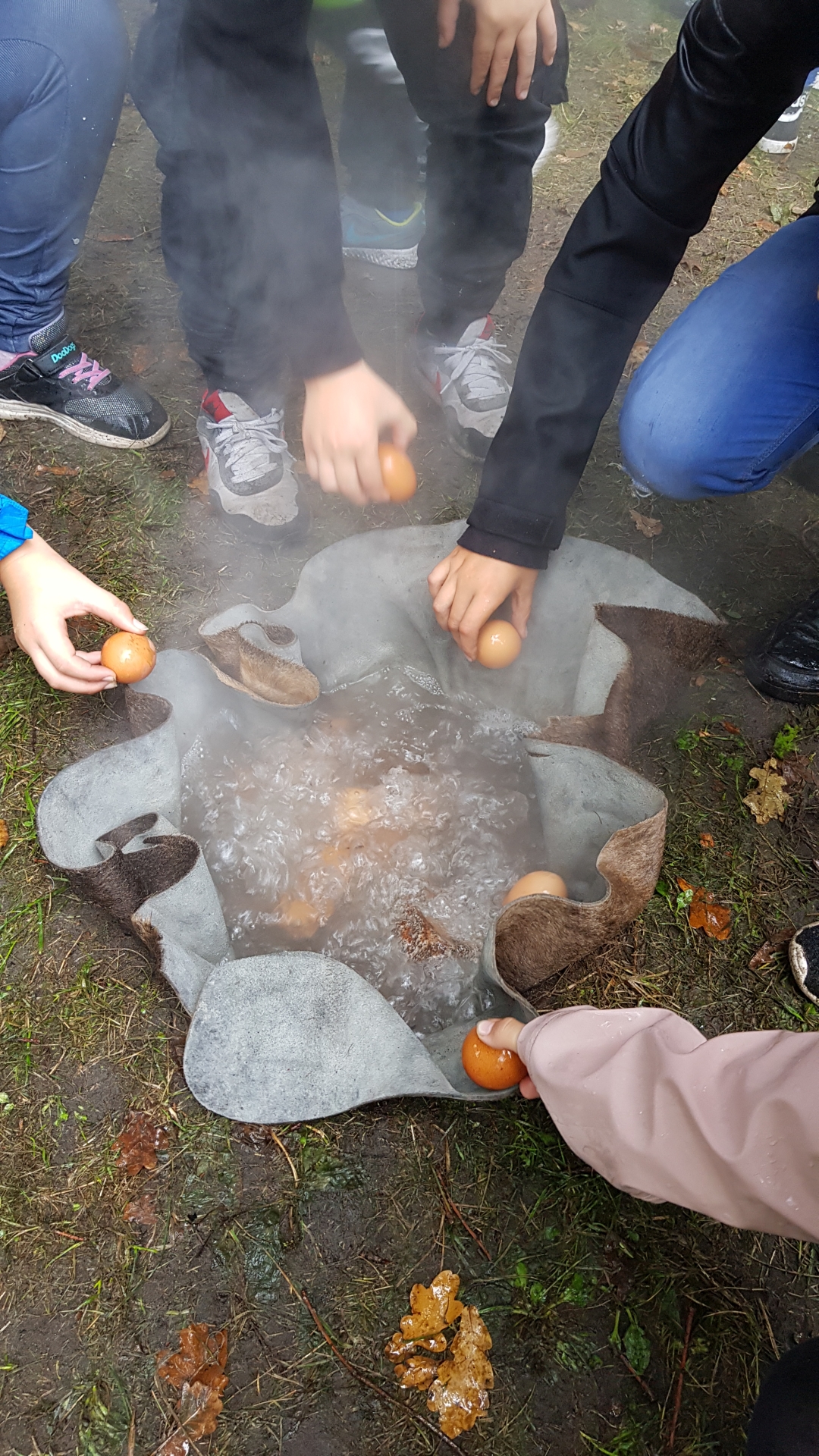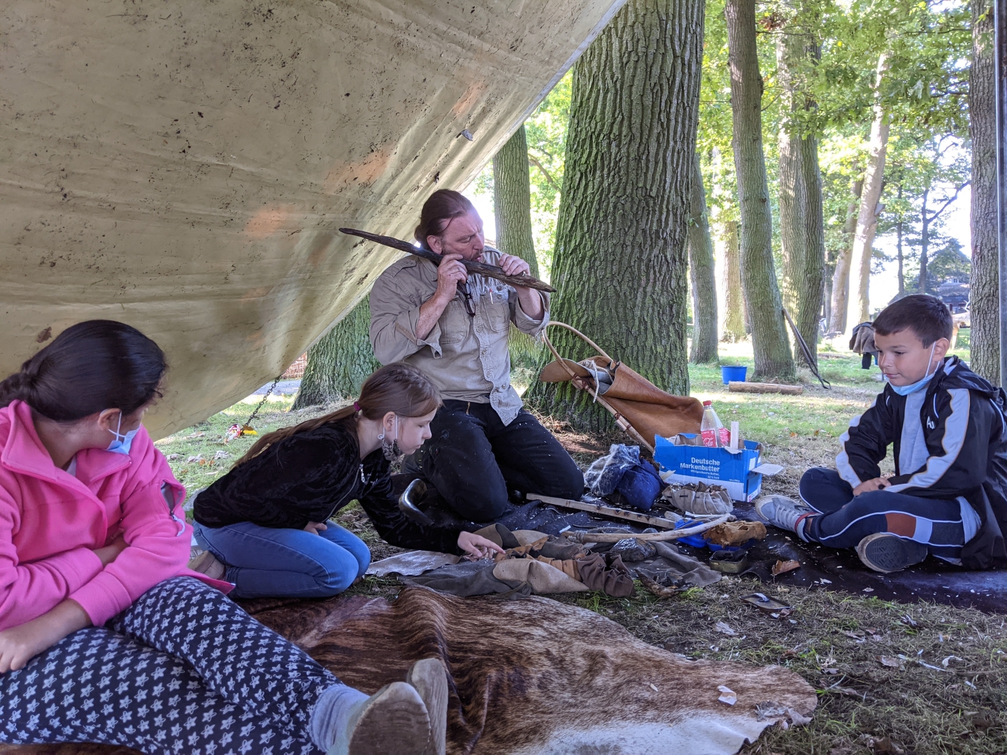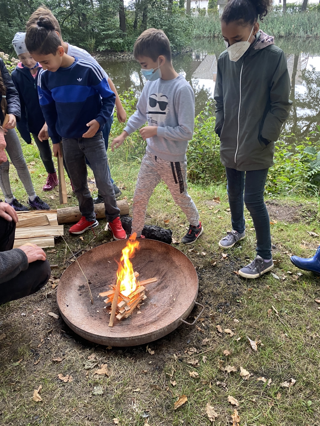 Für die Schüler wurde dank Herrn Dr. Hans Joachim Behnke greifbar, welche Werkzeuge die Menschen in der Steinzeit nutzten, aber auch, wie damals Zelte gebaut wurden. Sie machten wie die Steinzeitmenschen unter Anleitung von Herrn Thorsten Helmerking Feuer. Anschließend erhitzten sie damit Wasser und konnten Eier kochen und diese auch essen. Natürlich mit Salz, das sie zuvor aus Salzwasser gewonnen haben.