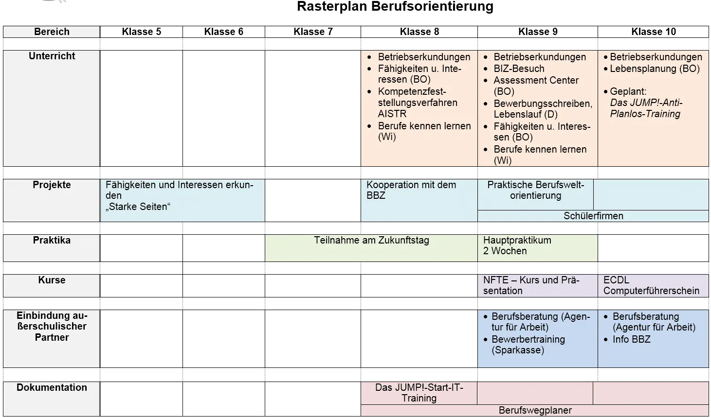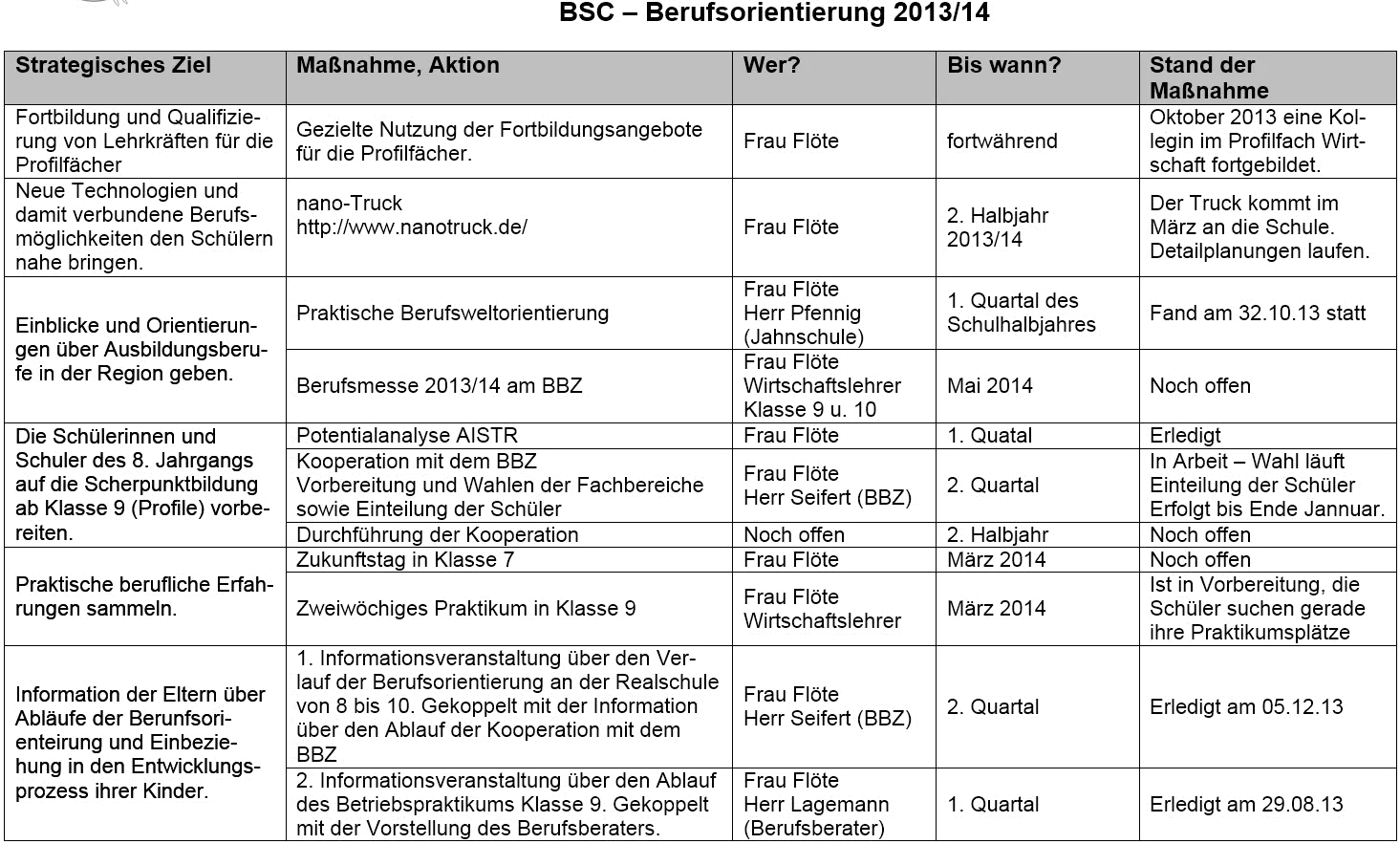 Jeder Schüler führt einen Nachweis, in dem die Teilnahme an berufsorientierenden Maßnahmen dokumentiert wird. Denn alle Entscheidungsabläufe sollen nachhaltig für die Schülerinnen und Schüler verfügbar sein. Dafür ist ab der 8. Klasse ein Berufswegplaner eingeführt.