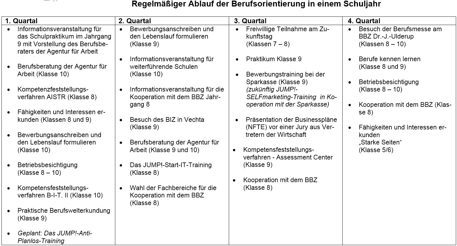 Die Schule gibt Gelegenheit zum Besuch des Berufsinformationszentrums (BIZ) in Vechta. Der Besuch wird im Wirtschaftsunterricht vorbereitet und zusammen mit dem zuständigen Berufsberater der Agentur für Arbeit durchgeführt. Auch im Nachhinein werden Beratungen des Berufsberaters in regelmäßigen Abständen angeboten. Angebote zur Berufsorientierung durch das BIZ werden den Schülerinnen und Schülern mitgeteilt.
