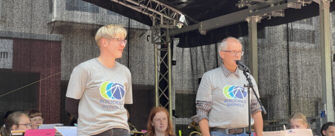 Neue T-Shirts für die Bläserklassen Ein Traum in Grau – die neuen Shirts mit dem neuen Logo der Realschule Diepholz. Möglich gemacht hat dies die Firma Delta - Safety & Protection, die der Realschule Diepholz zu Beginn des neuen Schuljahres 40 T-Shirts als „Bühnenkleidung“ für die Musiker der Bläserklassen gespendet hat. Wir bedanken uns herzlich bei der Firma Delta! Thomas Mengedoth, einer der Geschäftsführer der Firma Delta, überreicht dem Bläserklassenleiter Stephan Klöpzig die neuen T-Shirts