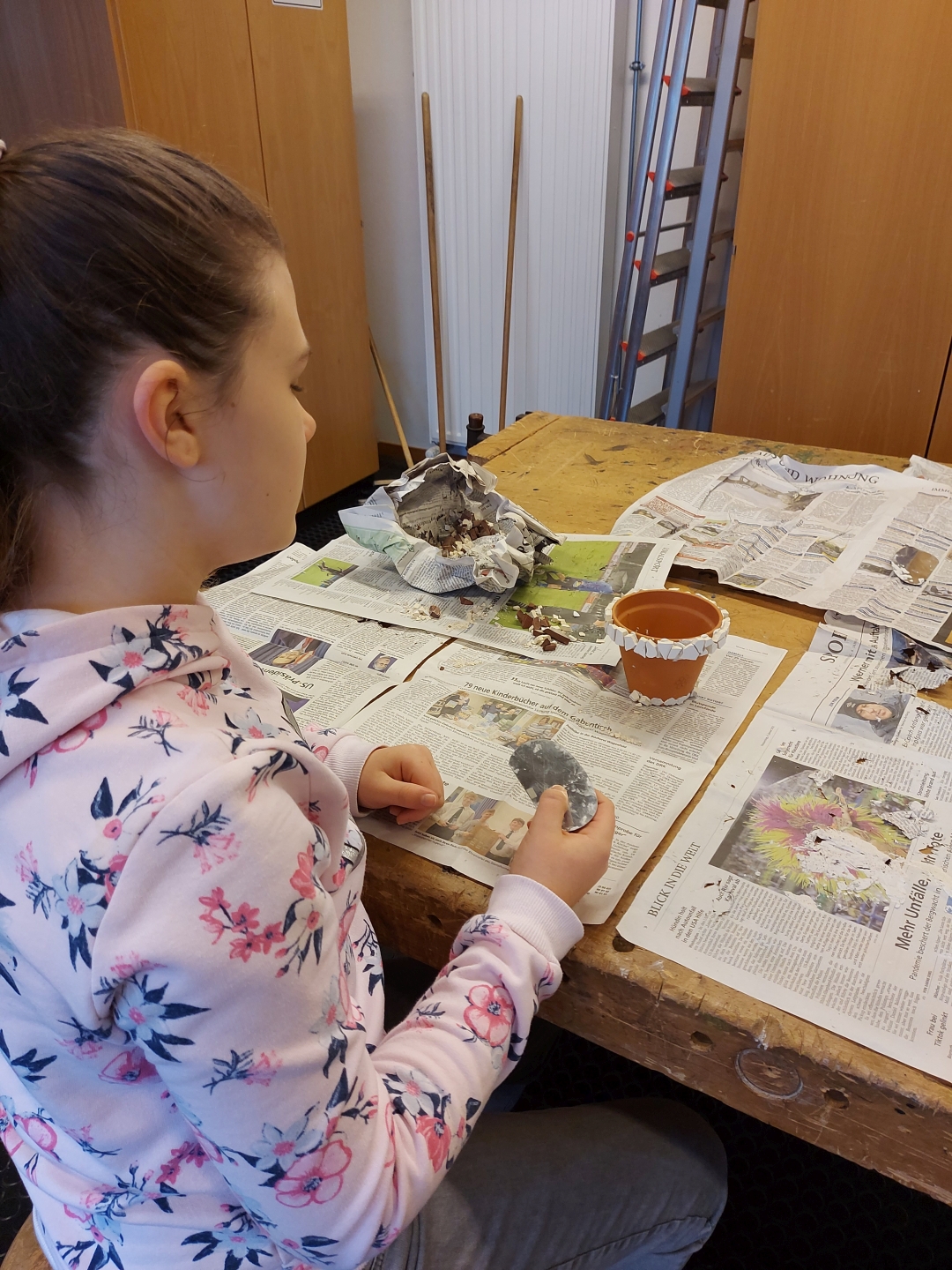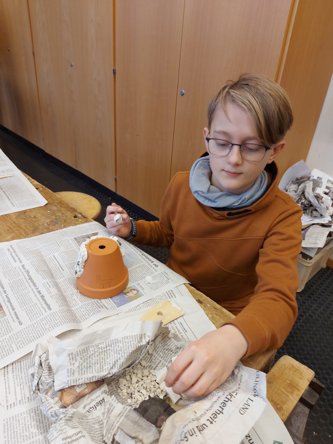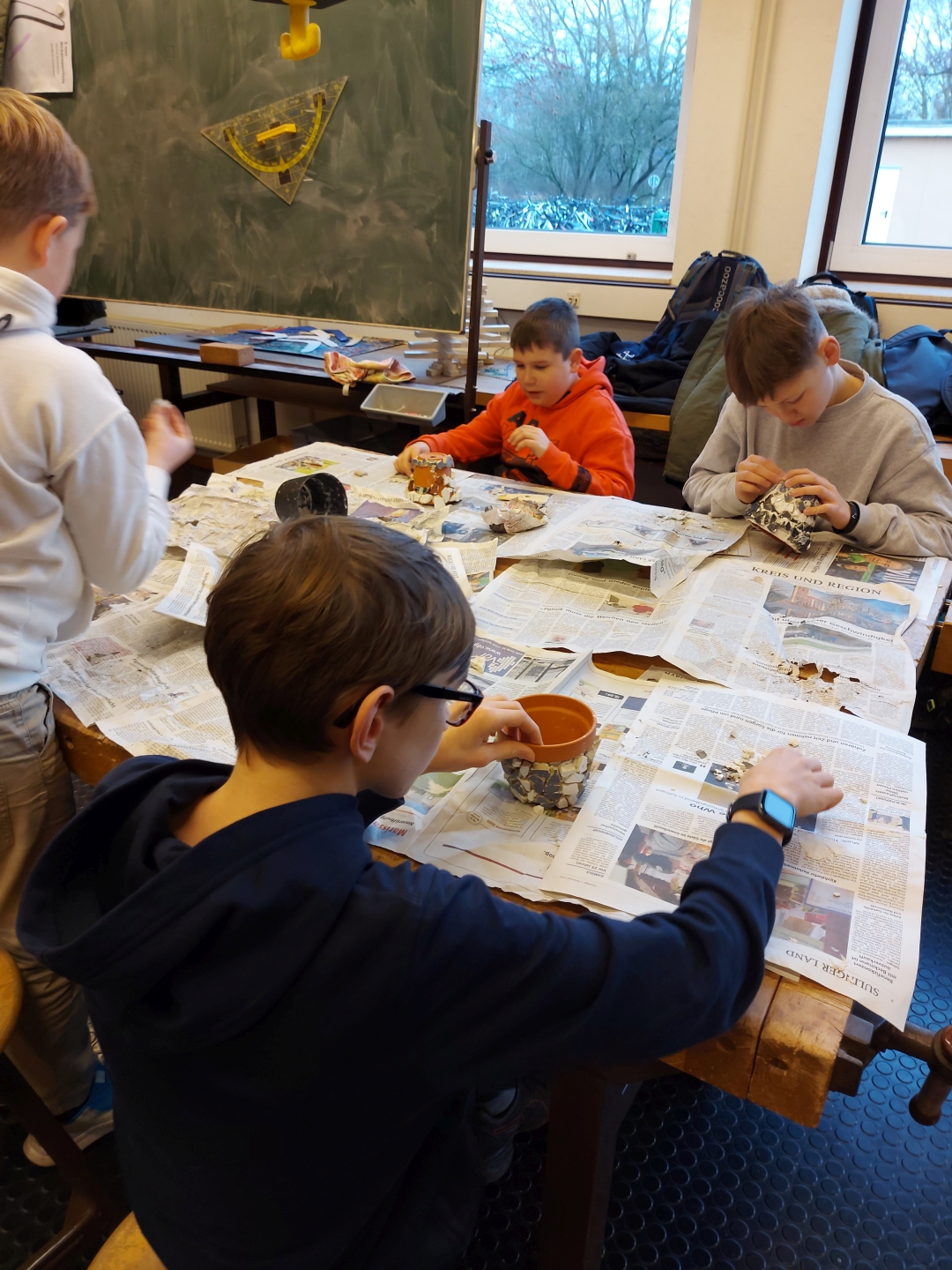 Auch der Wahlpflichtkurs „Gestaltendes Werken – Jahrgang 6“ wollte der Vogelwelt etwas Gutes tun, wenn die Temperaturen im Winter sinken. Also starteten die 16 Schülerinnen und Schüler des Kurses und bauten aus Tontöpfen und alten Fliesen Futterglocken für die Vögel im Garten, auf der Terrasse oder auf dem Balkon.
