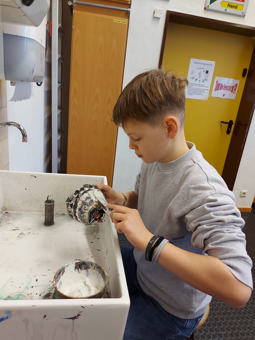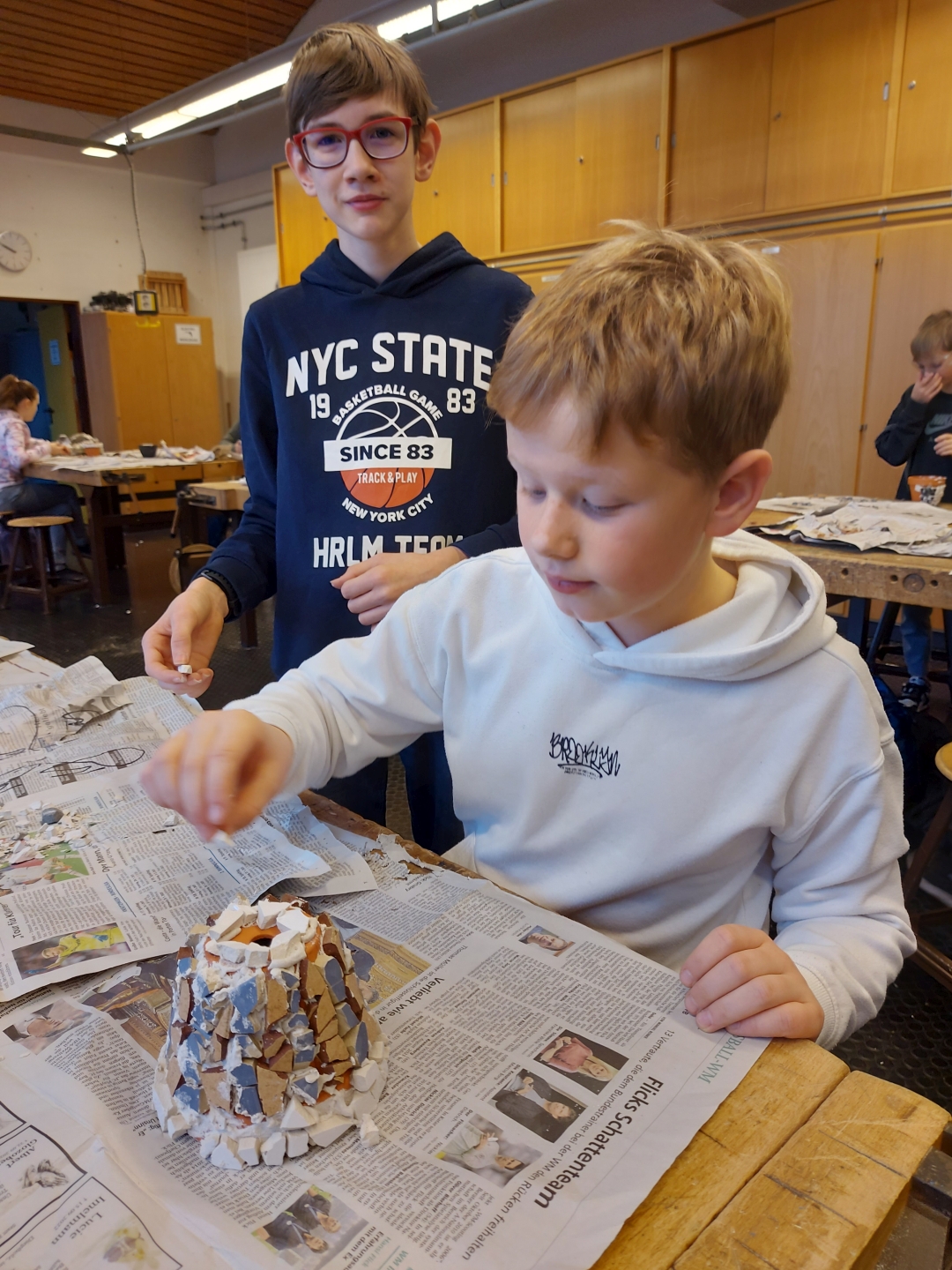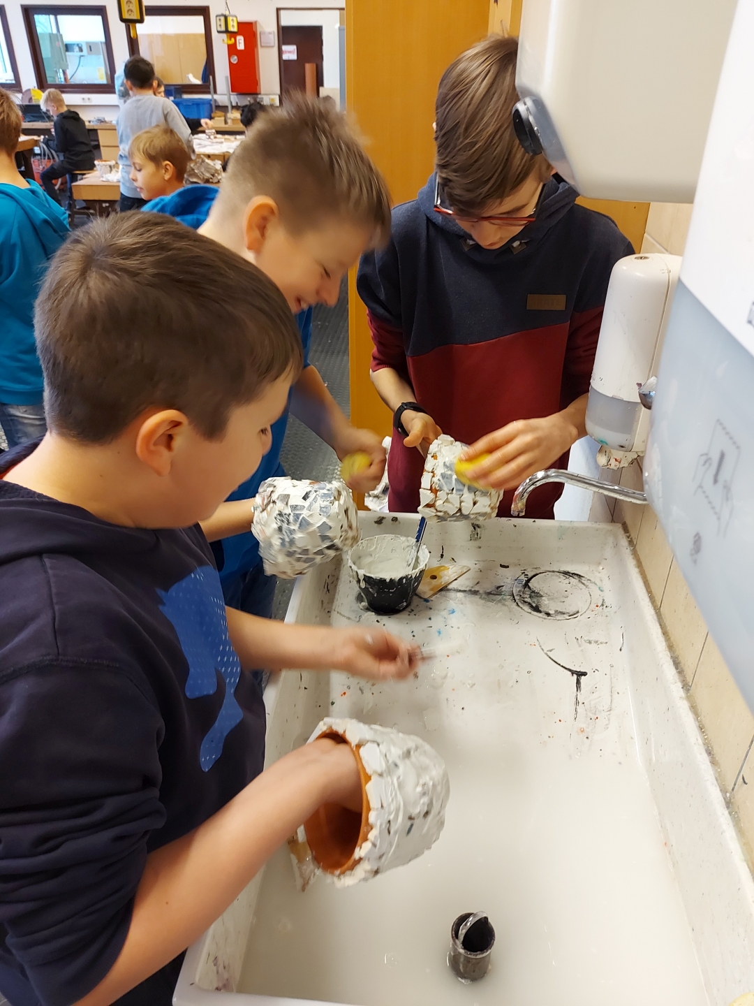 Auch der Wahlpflichtkurs „Gestaltendes Werken – Jahrgang 6“ wollte der Vogelwelt etwas Gutes tun, wenn die Temperaturen im Winter sinken. Also starteten die 16 Schülerinnen und Schüler des Kurses und bauten aus Tontöpfen und alten Fliesen Futterglocken für die Vögel im Garten, auf der Terrasse oder auf dem Balkon.
