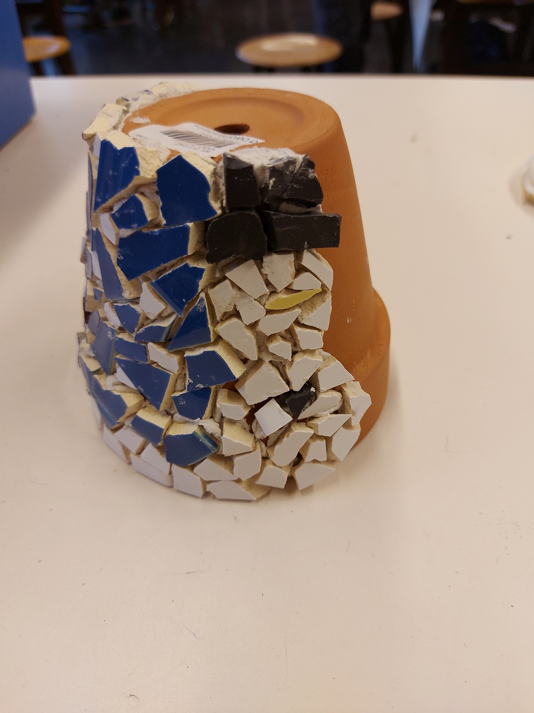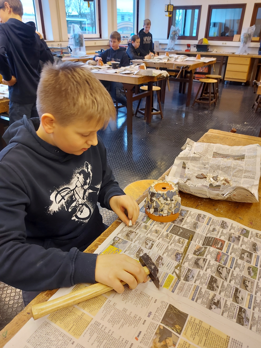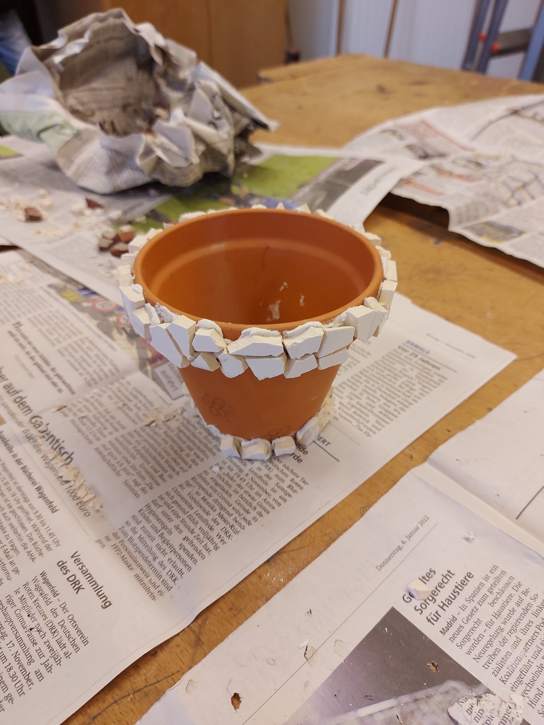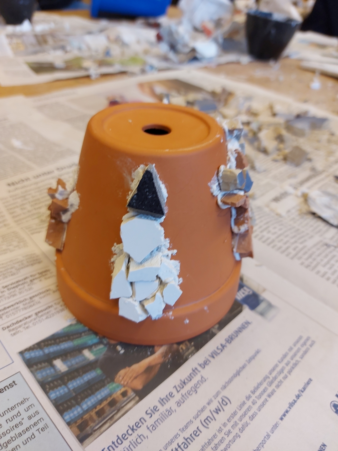 Anschließend recycelten die Kinder alte Fliesen. Unterschiedliche Fliesenfarben wurden mitgebracht und mit einem Hammer in kleine Mosaikstücke zerteilt. Je kleiner die Fliesen waren, desto besser konnte das Muster an den Tontopf angebracht werden.
