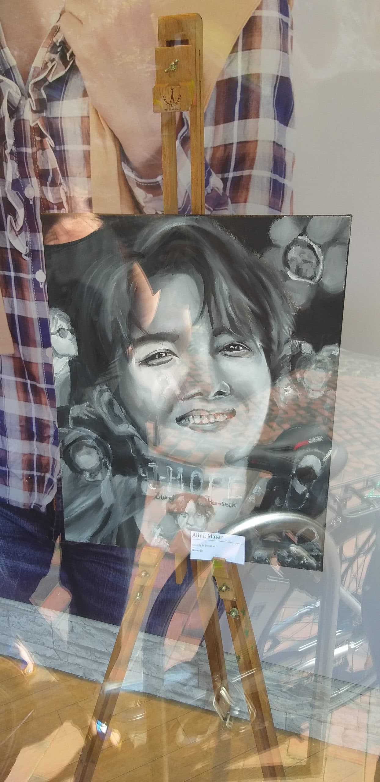Darunter befinden sich einige Landschaftsgemälde von Phillip Dziachan aus der 10c, Portraits in Öl von Alina Maier aus der 10a, Zeichnungen von Lina Leduc und Niklas Diekmeier aus der 7b, sowie fotografische Werke aus dem Unterricht von Frau Aumüller aus Jahrgang 8.