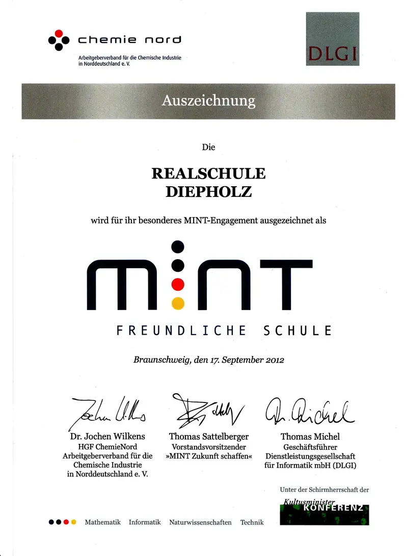 MINT-freundliche Schulen müssen einen einheitlichen Kriterienkatalog mit 14 Kriterien erfüllen. Mit Stolz bemerkte die Delegation aus der Kreisstadt, dass die Realschule Diepholz bei der Auszeichnungsveranstaltung im Rahmen der Jahrestagung der Gesellschaft für Informatik in Braunschweig die einzige Schule in der Wertungsgruppe Sekundarstufe I und II war, die keine Oberstufe hatte. Alle anderen Schulen der Wertungsgruppe waren Gymnasien oder Gesamtschulen.