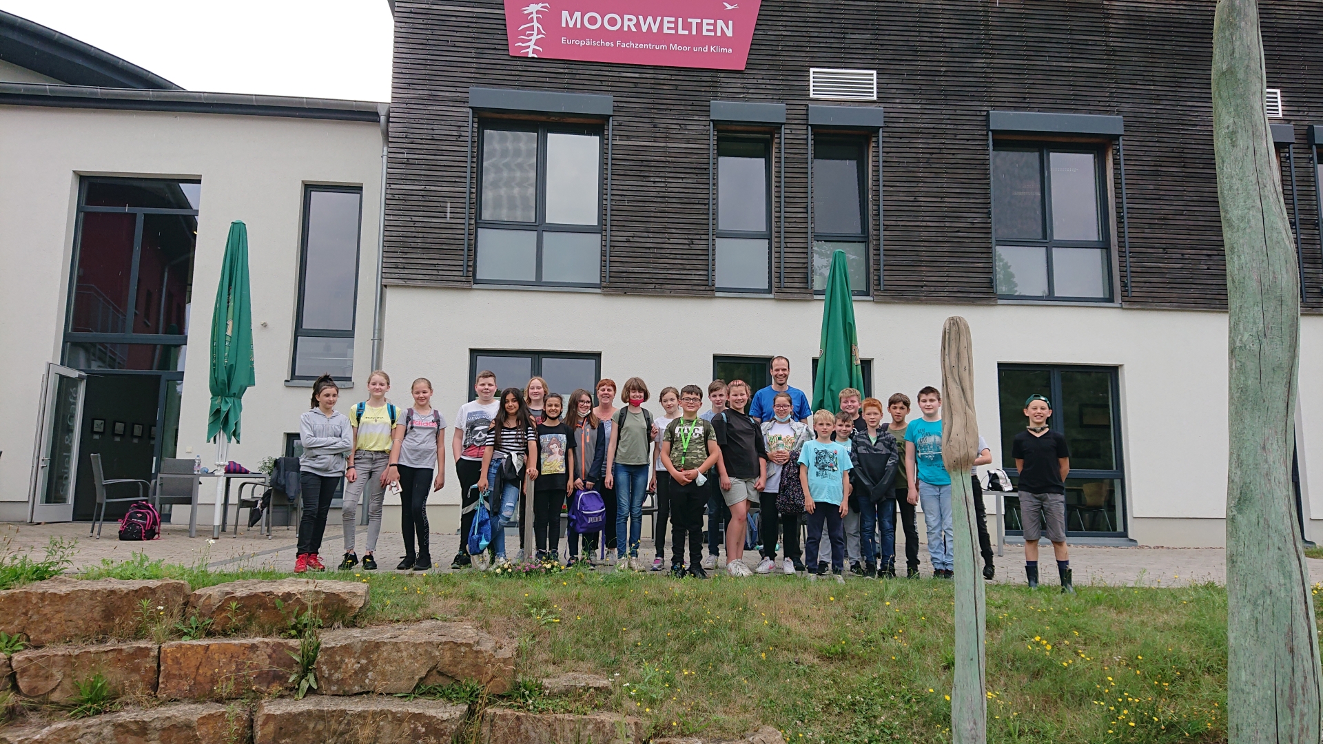 Gemeinsam mit Moorführern und ihren Klassenlehrern ging es nach der Ausstellung mit der Moorbahn „Emma“ bei mitunter norddeutschem Wetter direkt in den Lebensraum Moor. Doch wissbegierig trotzten die Kinder dem Regen und genossen den schönen Ausblick vom Aussichtsturm in die Moorlandschaft. Anschließend begann die Wanderung durch das Moor. An lebenden Beispielen lernten die Kinder die Bewohner des Schutzgebietes kennen. Besonders eindrücklich empfanden die Fünftklässlerinnen und Fünftklässler die Tatsache, dass es „richtige Schlangen“ im Moor gibt. Mit den gesammelten Natureindrücken ging es dann mit dem Bus nach einem aufregenden Tag wieder zurück in die Schule.