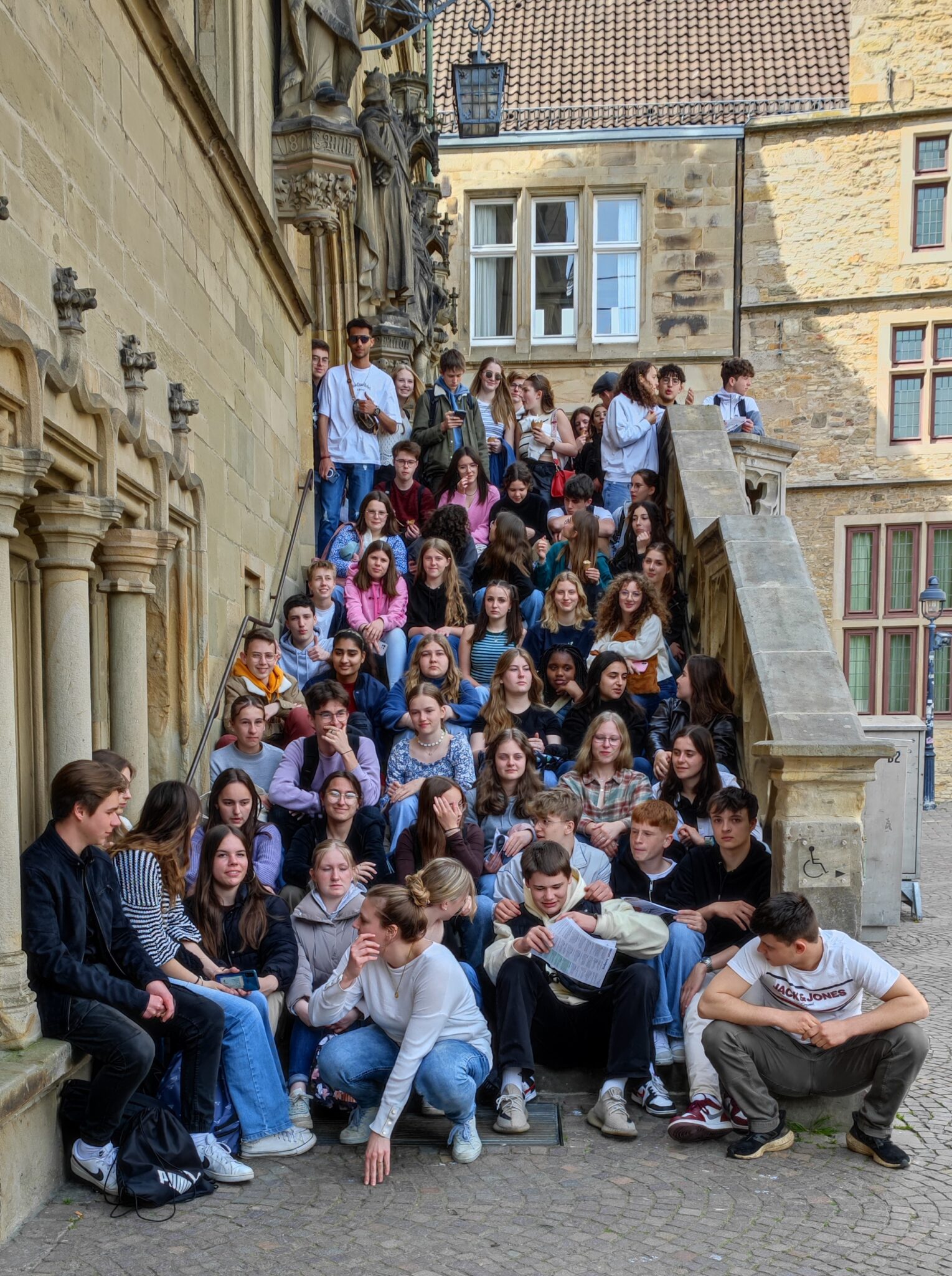 Am Dienstag Vormittag fand die offizielle Begrüßung unserer Corres statt: erst durch die Schulleiter Herrn Bahr und Herrn Buse in der Schule, dann im Rathaus von dem Bürgermeister Herrn Marré. Anschließend machten wir uns in deutsch-französischen Kleingruppen auf, die Stadt zu erkunden. Hierbei gab es die Aufgabe, 6 Fotos aufzunehmen, die am nächsten Tag präsentiert werden sollten.