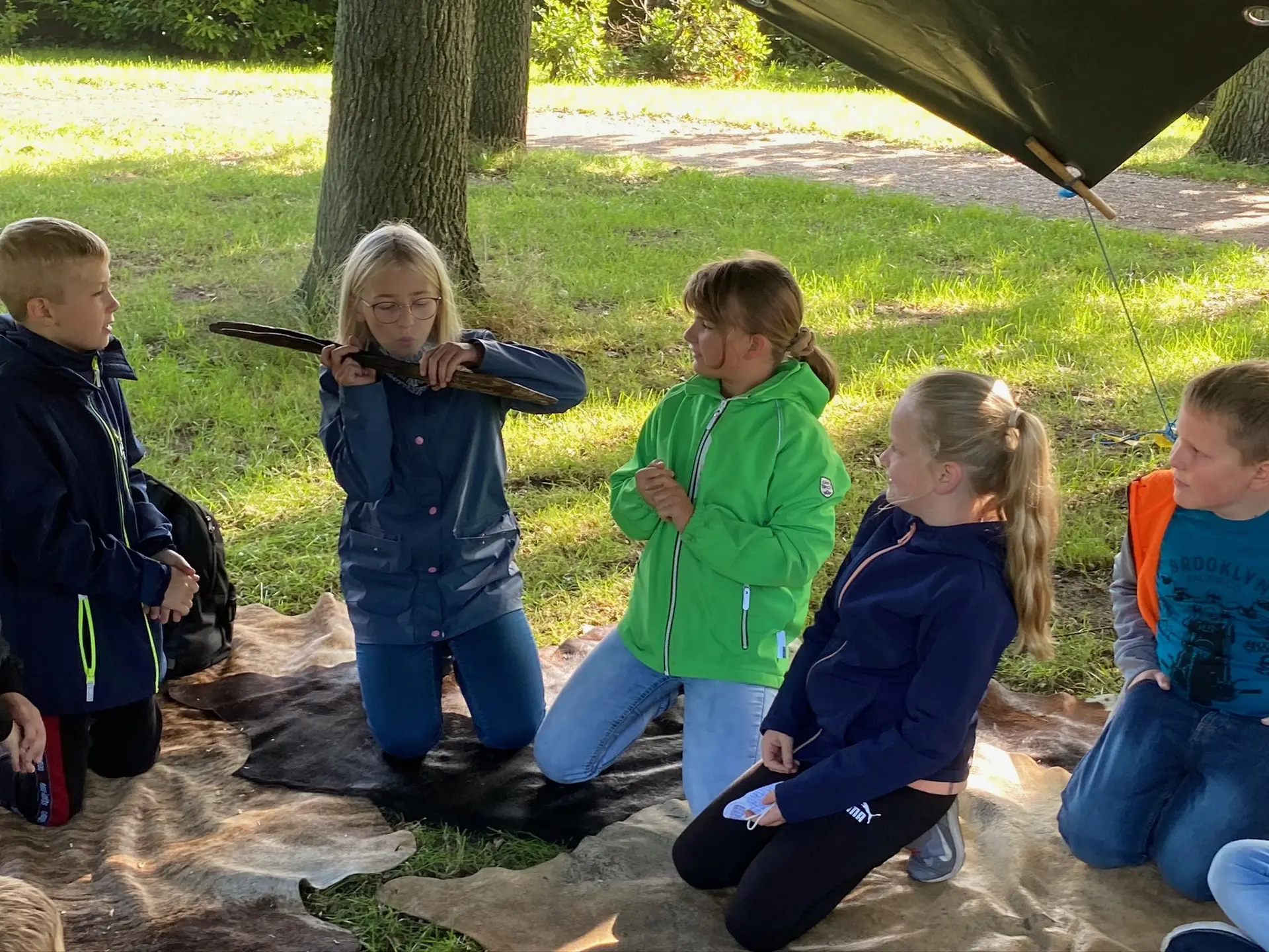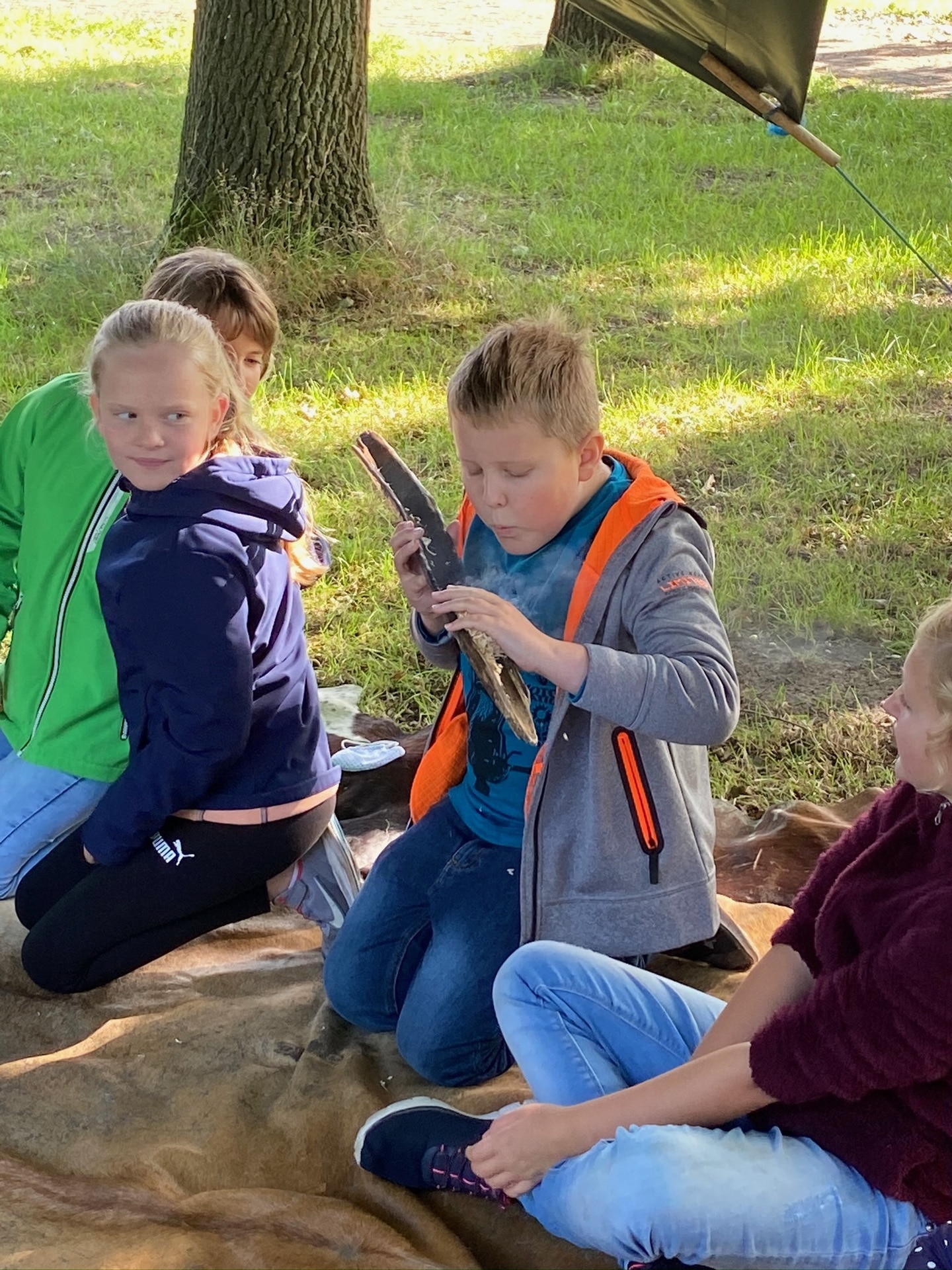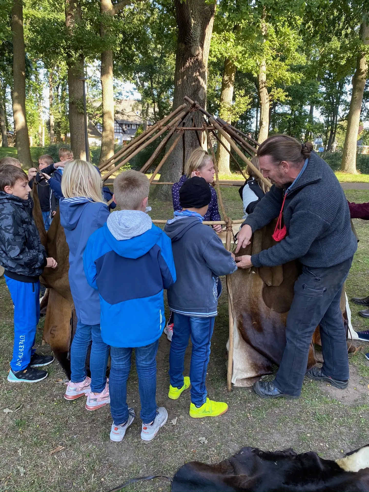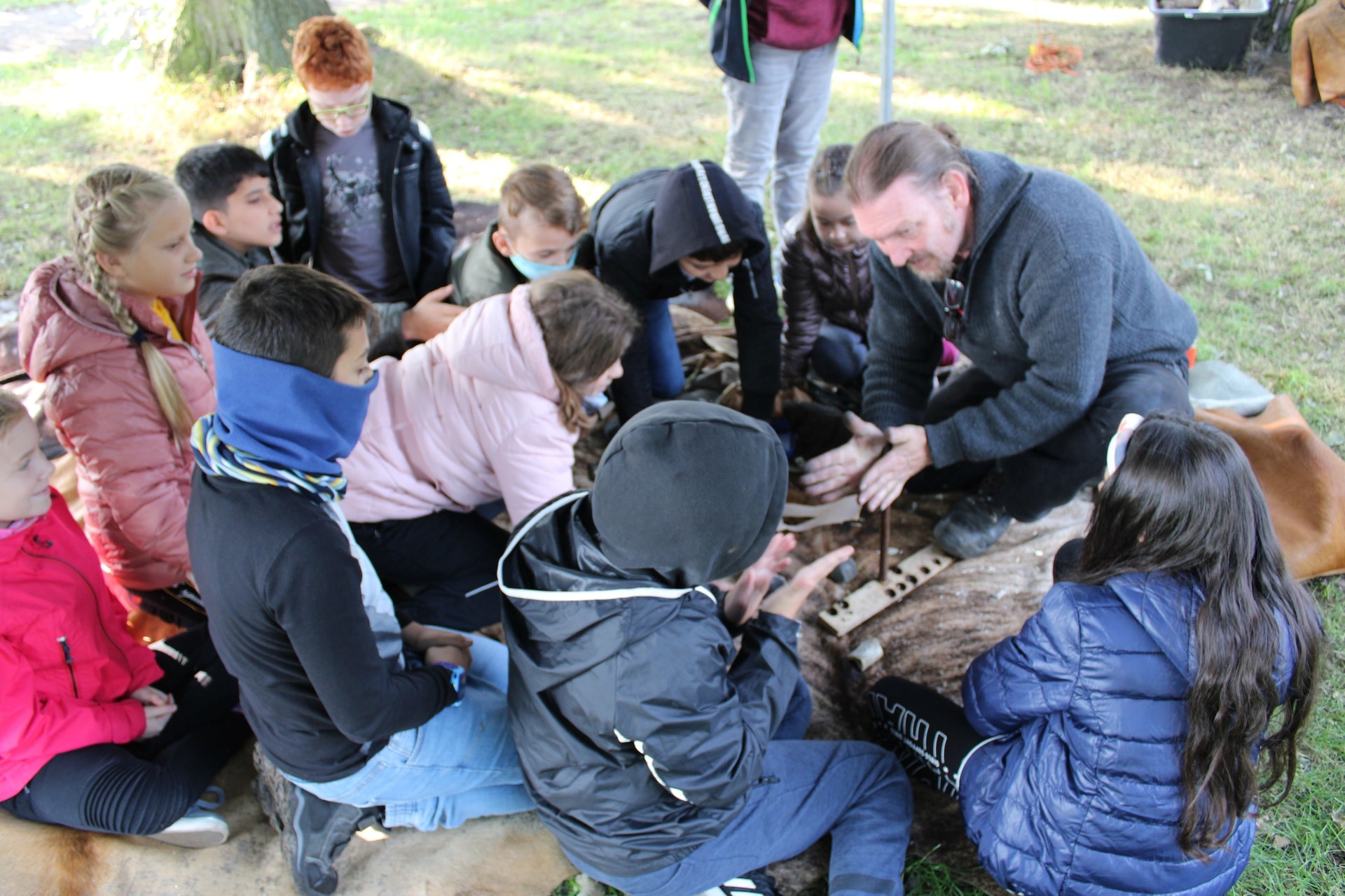 Mithilfe der experimentellen Archäologen Dr. Hans Joachim Behnke und Thorsten Helmerking erfuhren die vier 5. Klassen hautnah, welche Jagdwerkzeuge es gab, wie die Bodenbeschaffenheit am Dümmer zur Steinzeit war, wie man sich einen Unterschlupf baute, dort lebte, Feuer machte und mit dem Einbaum ins Jagdgebiet fuhr.