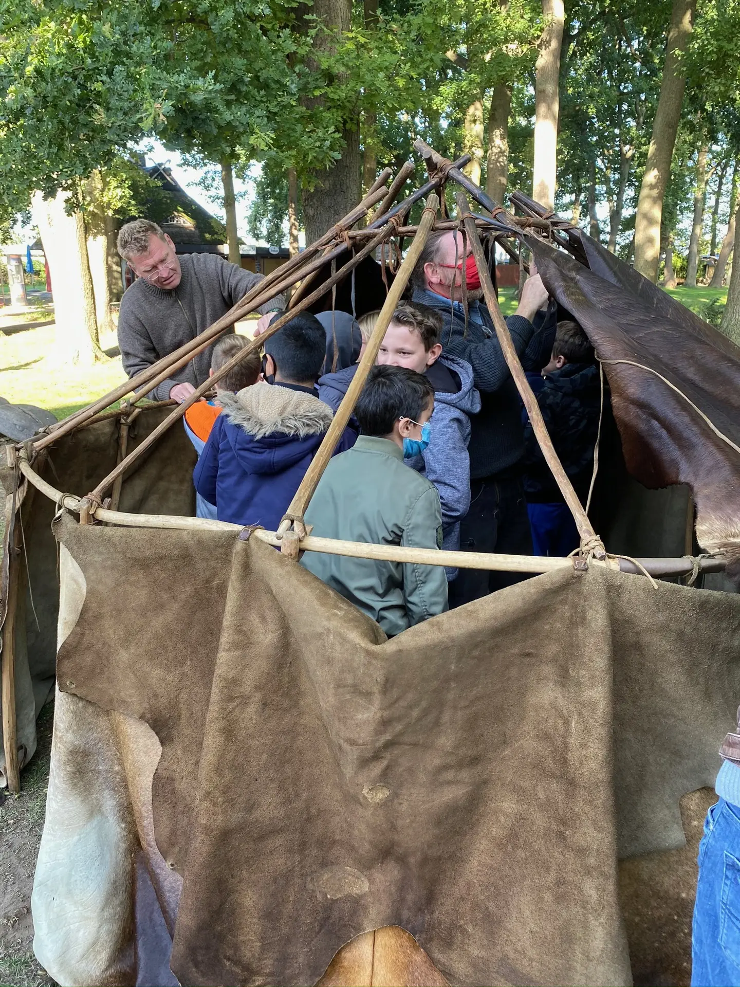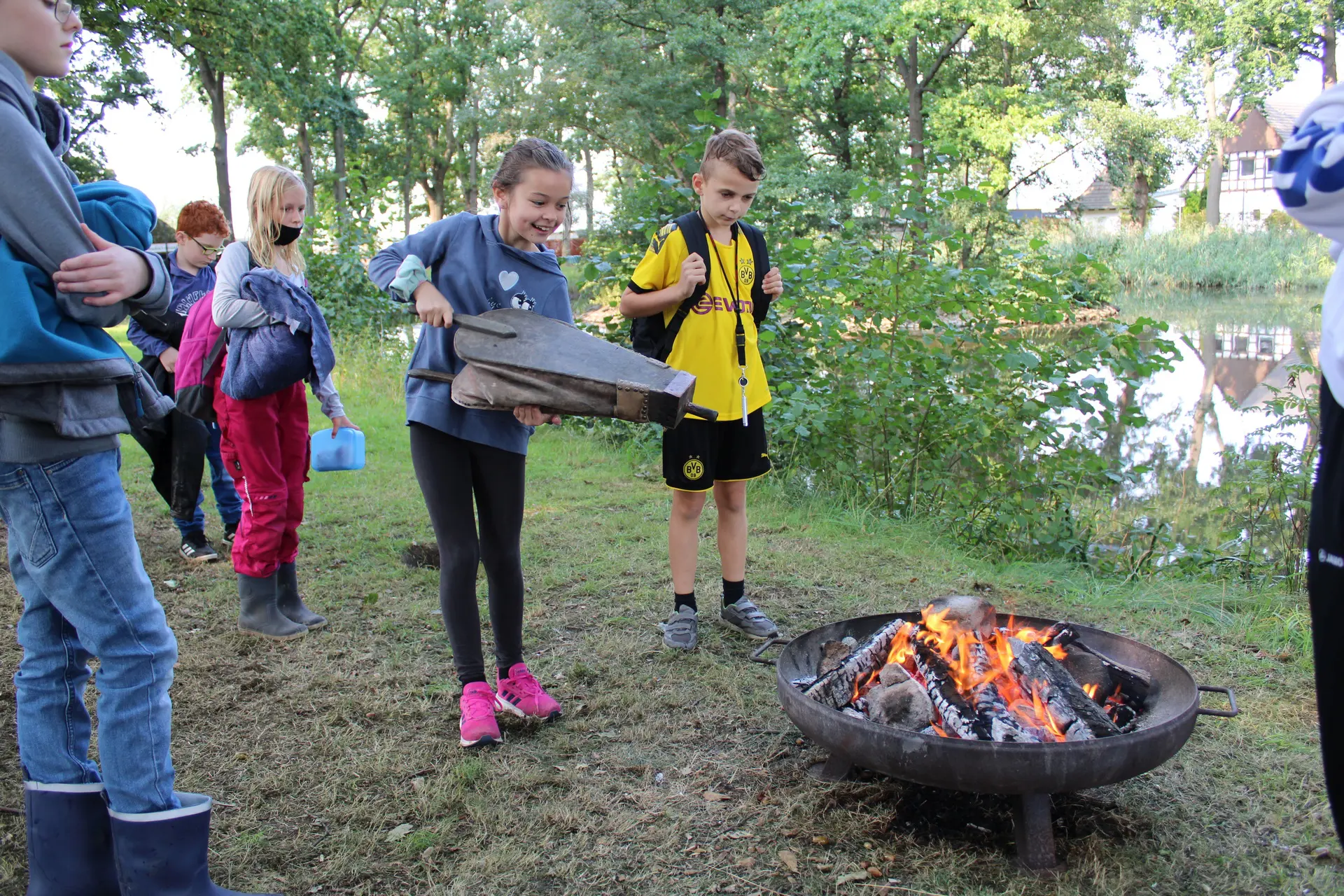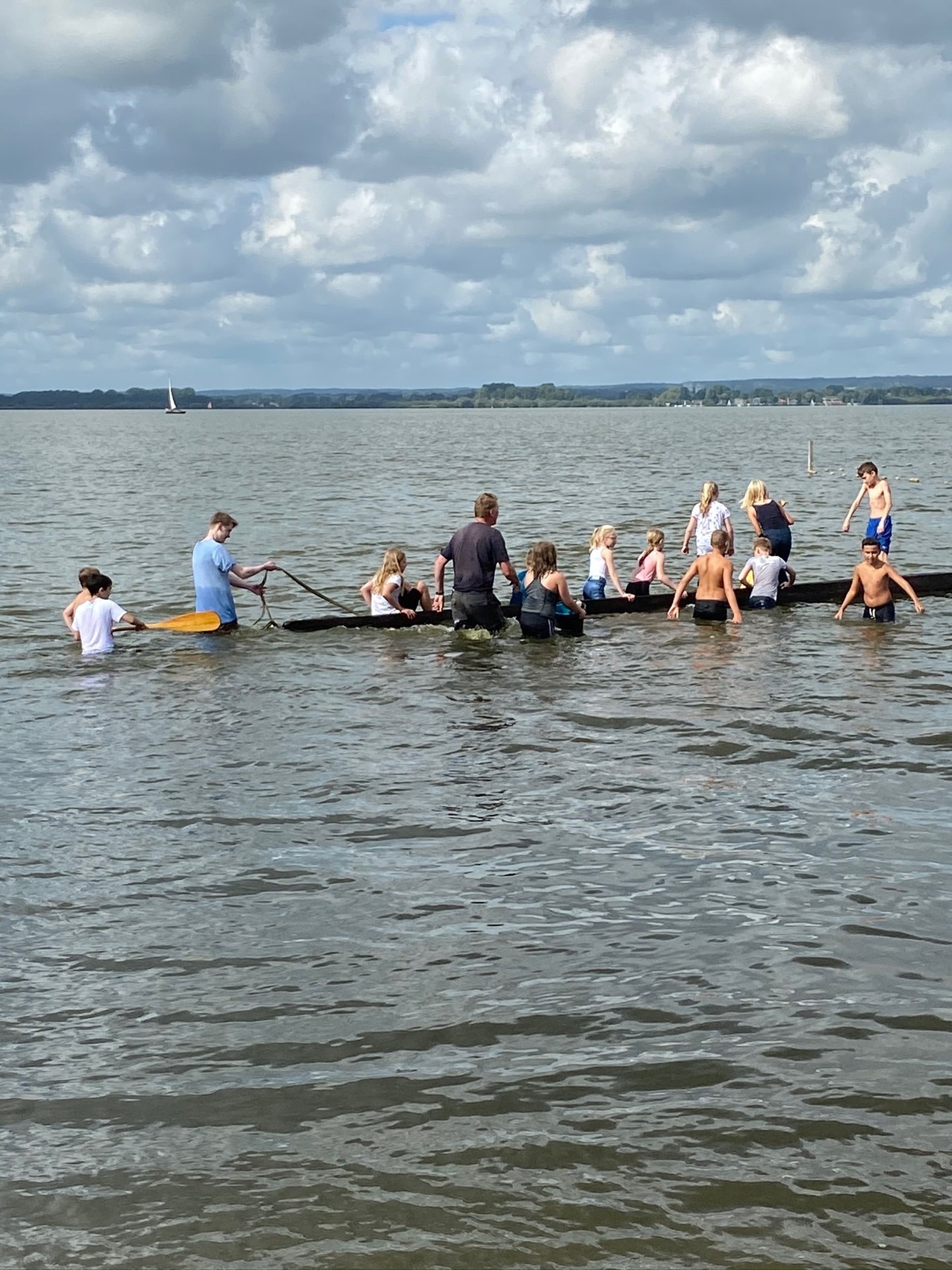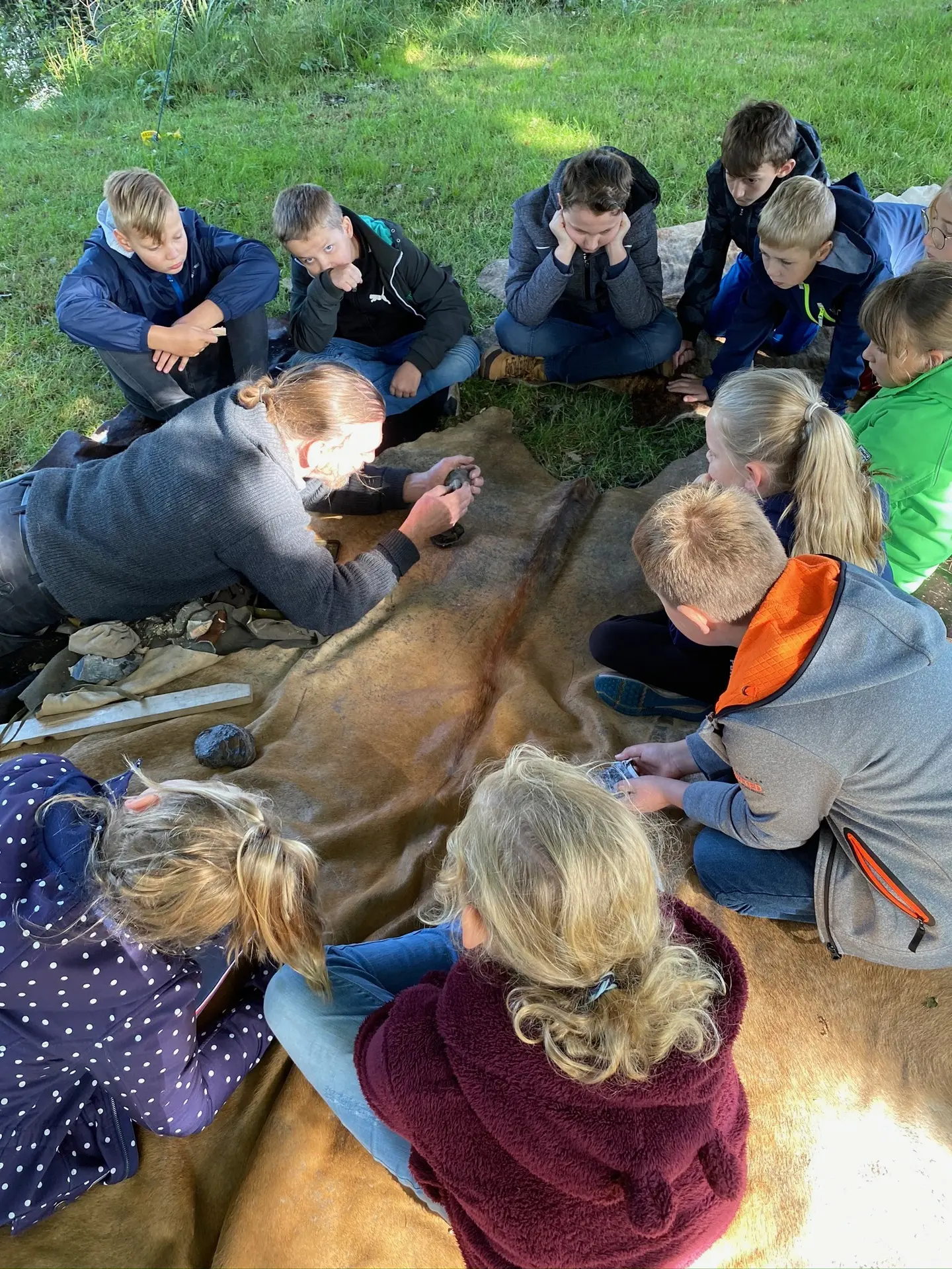 Mithilfe der experimentellen Archäologen Dr. Hans Joachim Behnke und Thorsten Helmerking erfuhren die vier 5. Klassen hautnah, welche Jagdwerkzeuge es gab, wie die Bodenbeschaffenheit am Dümmer zur Steinzeit war, wie man sich einen Unterschlupf baute, dort lebte, Feuer machte und mit dem Einbaum ins Jagdgebiet fuhr.