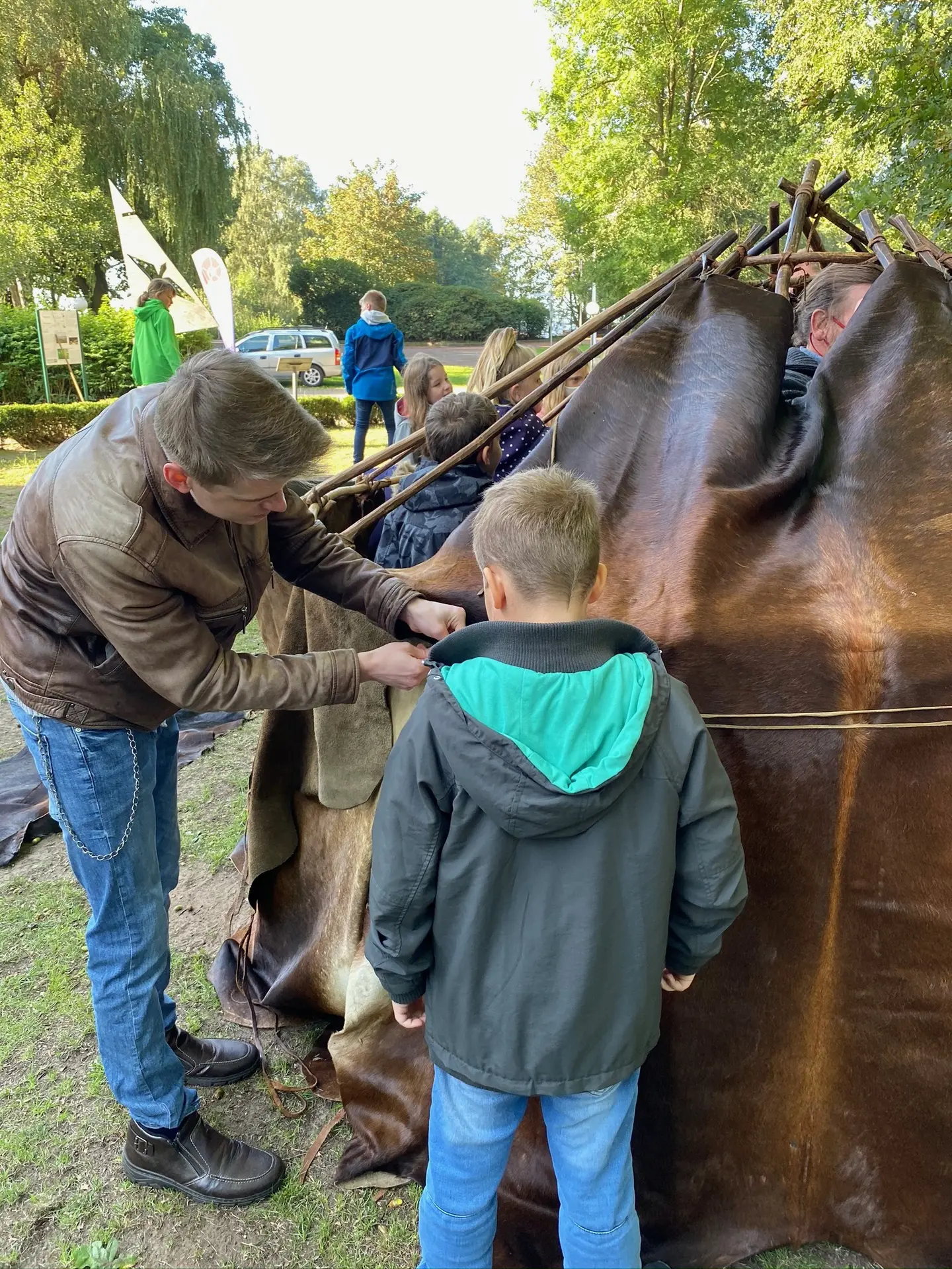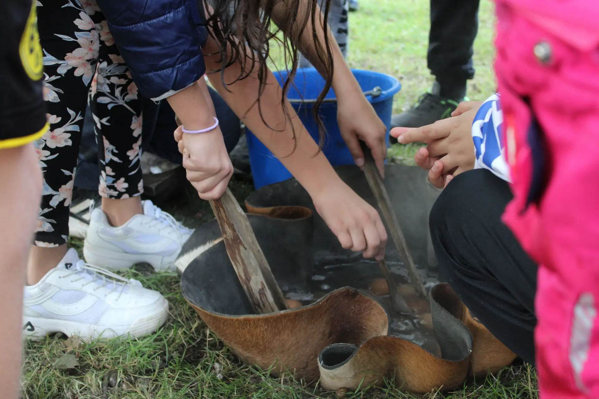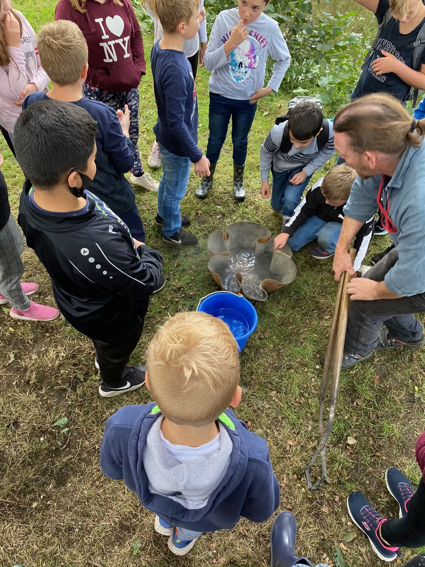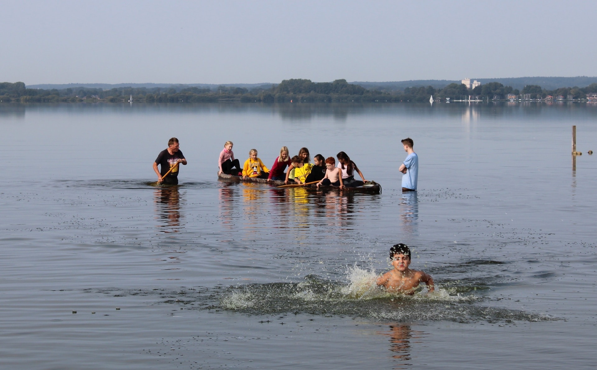 Mithilfe der experimentellen Archäologen Dr. Hans Joachim Behnke und Thorsten Helmerking erfuhren die vier 5. Klassen hautnah, welche Jagdwerkzeuge es gab, wie die Bodenbeschaffenheit am Dümmer zur Steinzeit war, wie man sich einen Unterschlupf baute, dort lebte, Feuer machte und mit dem Einbaum ins Jagdgebiet fuhr.