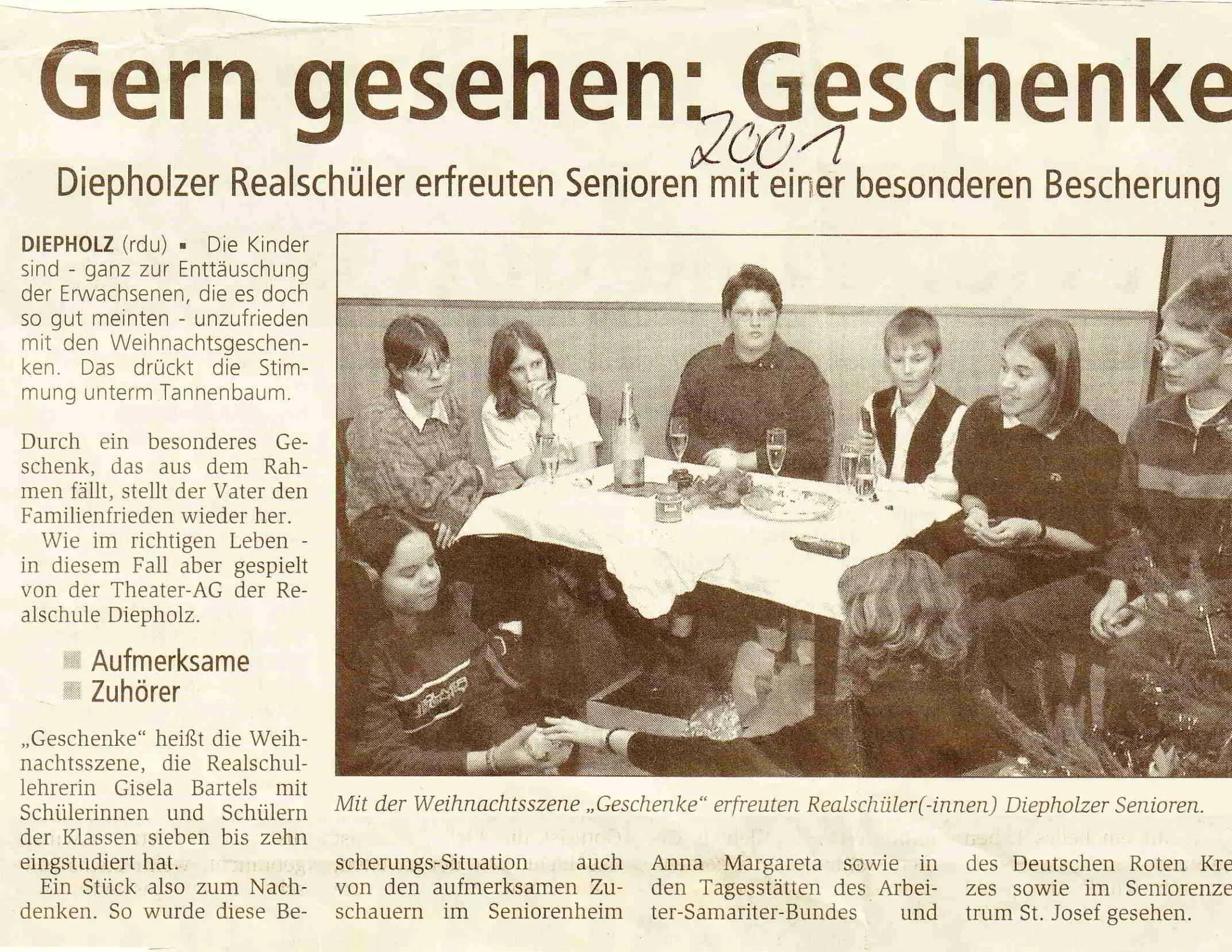 Mit der Kurzszene „Schule früher – heute“ waren wir im Frühjahr 2001 beim Schulfest anlässlich des Schuljubiläums vertreten. Wie im Vorjahr führten wir unsere kleine Weihnachtszene „Geschenke“ in Diepholzer Seniorenheimen auf.