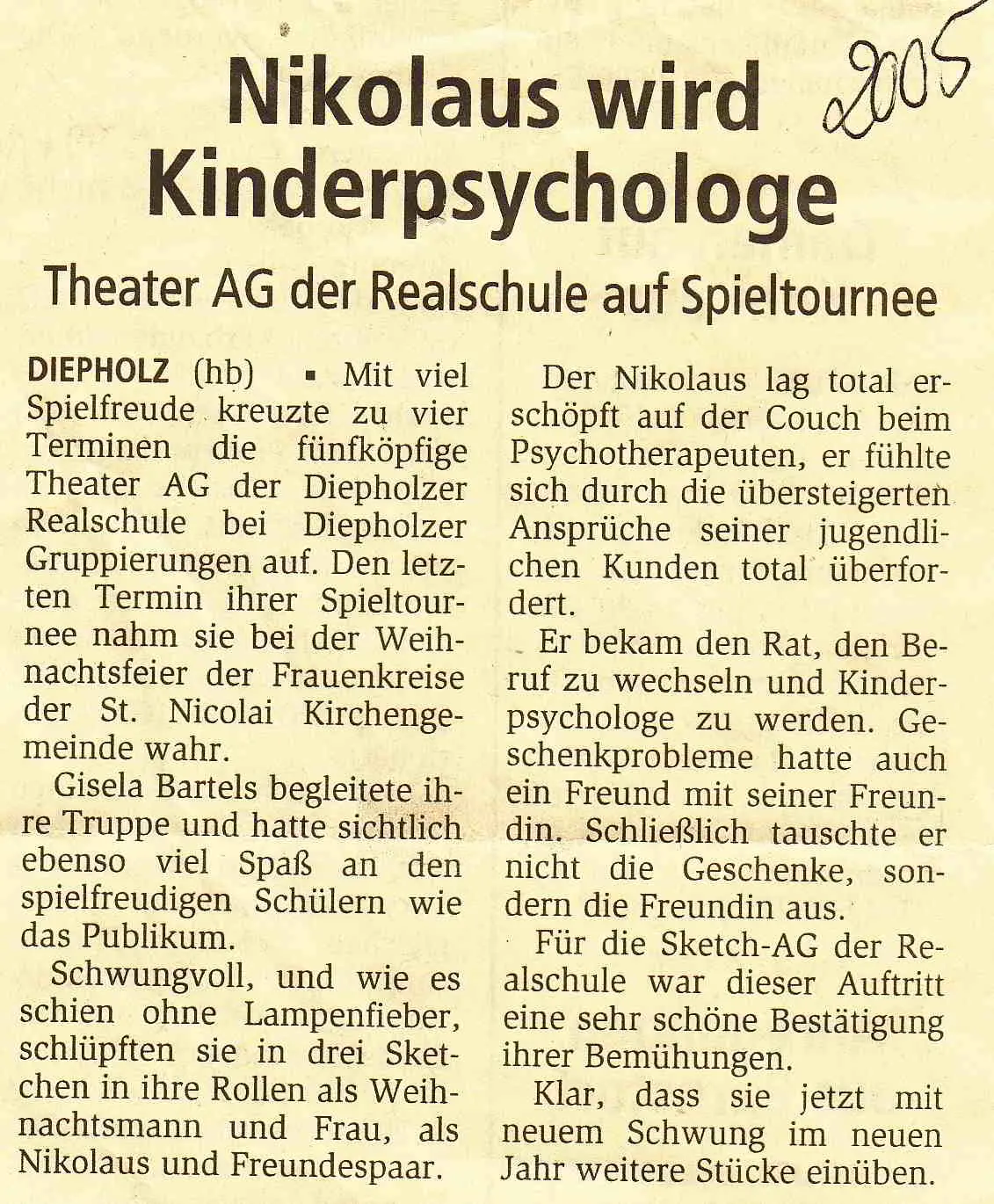 Die nächste Aufgabe war ein Theaterstück, das sich mit dem „Nachwuchs im Jahr 2222″ auf kritische und unterhaltsame Weise beschäftigte. Es kam bei der Entlassung der 10. Klassen 2006 und im Krankenhaus Diepholz zur Aufführung.