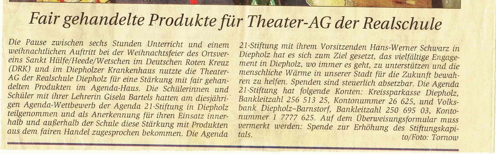 Wir nahmen im Jahr 2005 am Wettbewerb der Agenda 21 teil und erhielten als Lohn für unser Theaterstück, das den Handel mit der Dritten Welt zum Thema hatte, ein „faires“ Frühstück im Agendabüro.