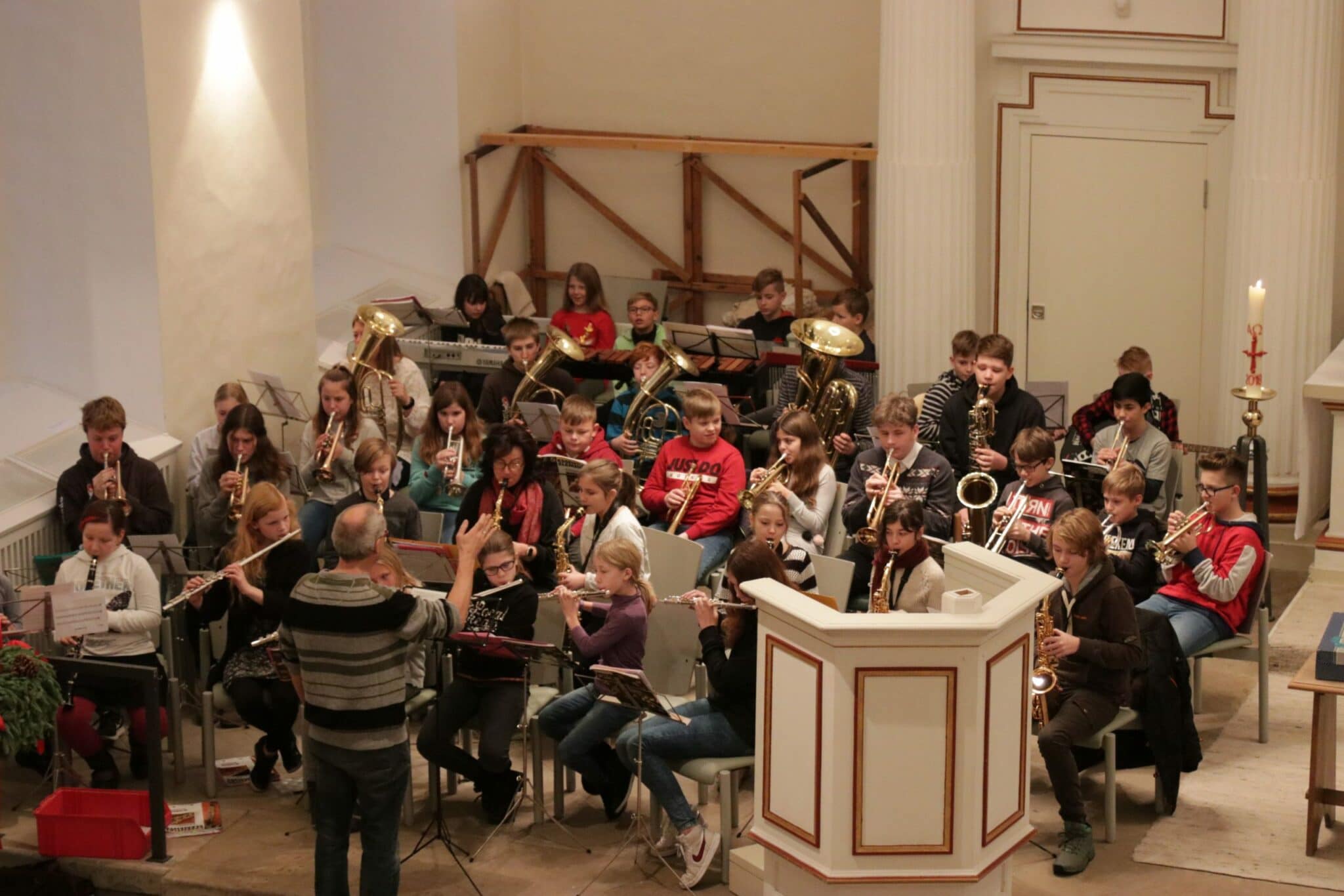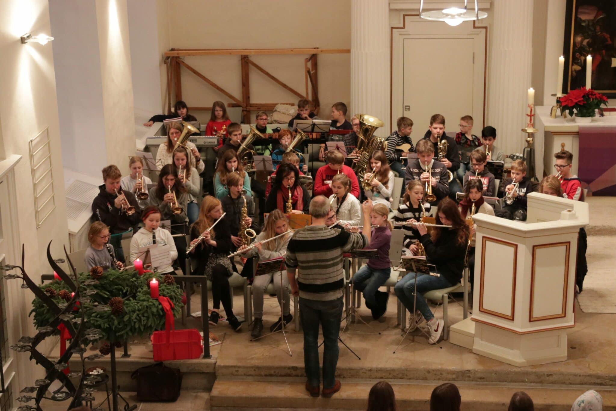 Voller Inbrunst sangen alle Weihnachtslieder „Wir sagen euch an den lieben Advent“, Hört der Engel helle Lieder“, „Macht euch bereit“ und „O du fröhliche“, die im Musikunterricht einstudiert worden waren. Die Bläserklasse, unter der Leitung von Herrn Klöpzig, begleitete die Gemeinde gekonnt.