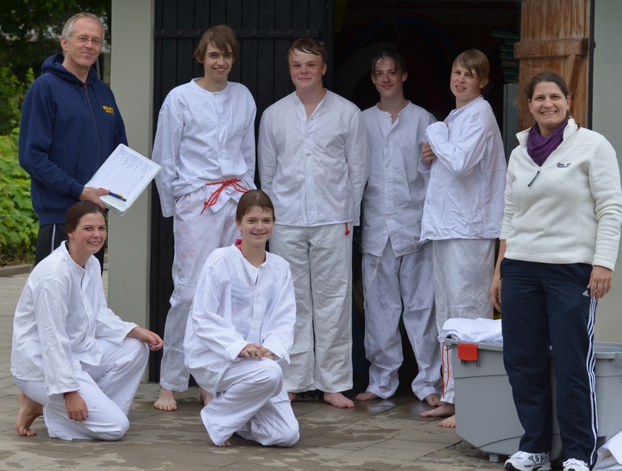 von li, oben: Jörg Pöttker (Prüfer), Philipp Fahland, Eike Logemann, Florian Dittmann, Pascal Diener, Anika Flöte (Sportlehrerin), unten: Joelina Riemann, Antonia Langhorst